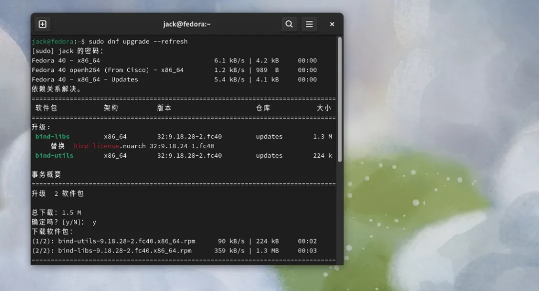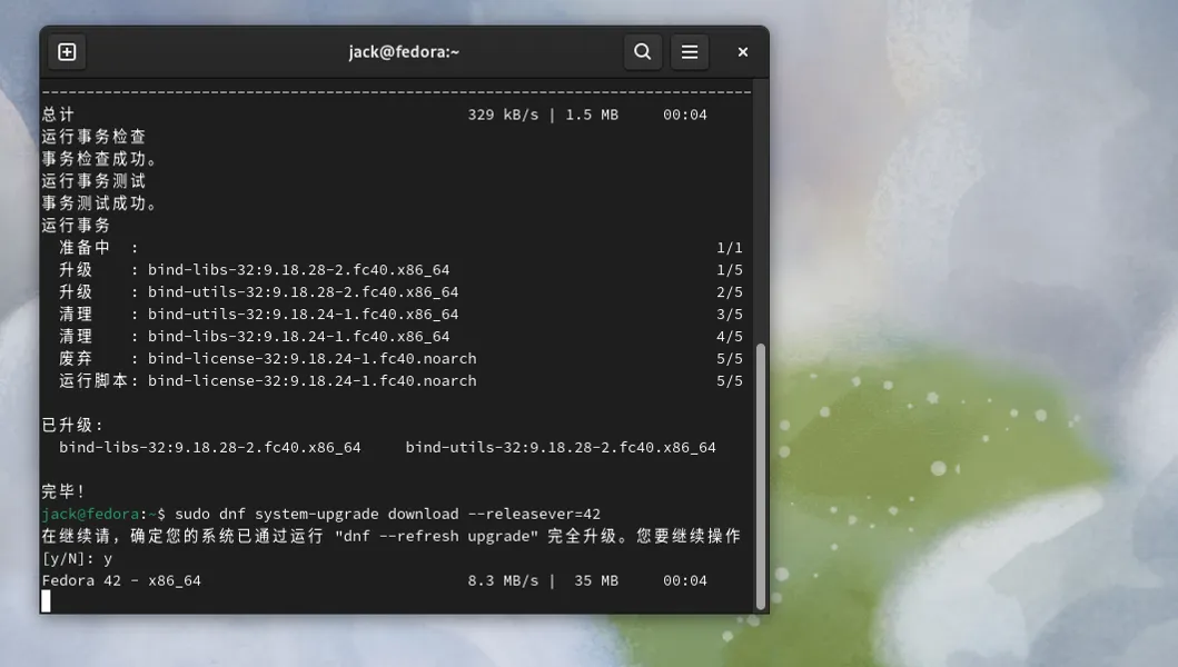 结果只有2个软件包需要更新,可能是执行升级的过程中,已经下载和安装了Fedora Linux 40版本的所有最新软件包。那么这2个软件包瞬间就更新完成了。sudo dnf system-upgrade download --releasever=42