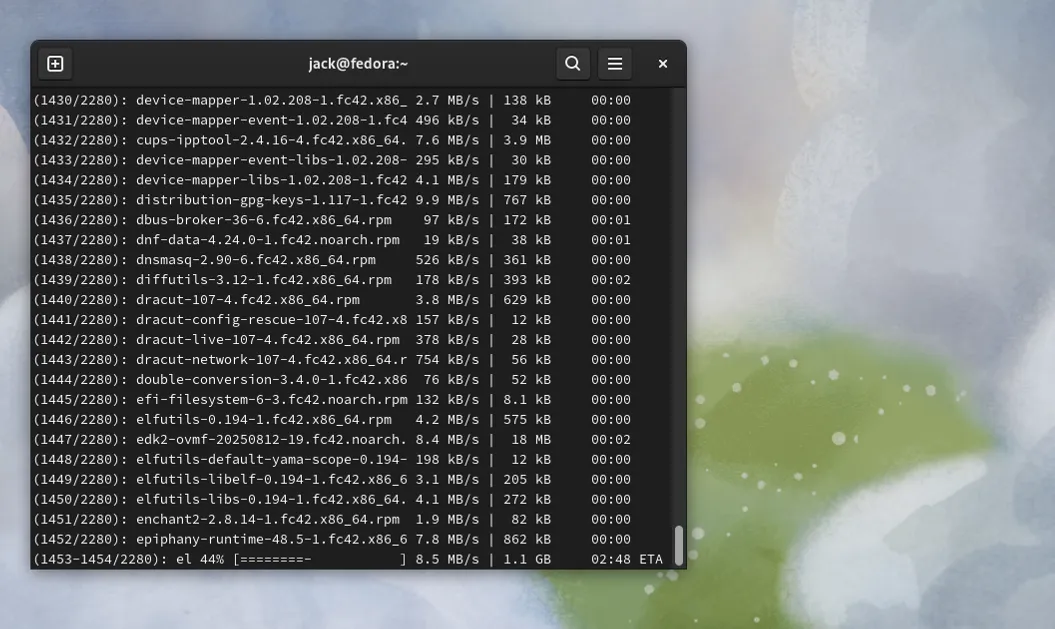 之前完成了把Fedora Linux从39升级到40。尽管升级的过程没有什么大问题,但是整个过程还是比较耗时的。一方面是软件包的确太多,差不多上千个,例外一方面是电脑的配置不行。Fedora Linux对直接使用DNF工具进行版本升级,是很早就开始支持了。最近这几年发展得很好,对更新的支持越发稳定可靠。以前是一个一个版本往上升级,后来也就可以跨版本升级了。但是跨版本不能太多,官方文档的提示,是可以跨一个版本升级,也就是从40升级到42。因为之前,没有跨版本升级过,也就跨一个版本试试,免得升级失败还要考虑回滚或者系统修复的问题。而且Fedora Linux 40在虚拟机电脑上,依然偶尔出现一下花屏,原因不明,这里不再过多深入研究原因了,毕竟已经是很早的版本,没准后续已经修复的这个问题。首先还是把要更新的软件包全部检查一下,有更新的全部都更新了。sudo dnf upgrade --refresh