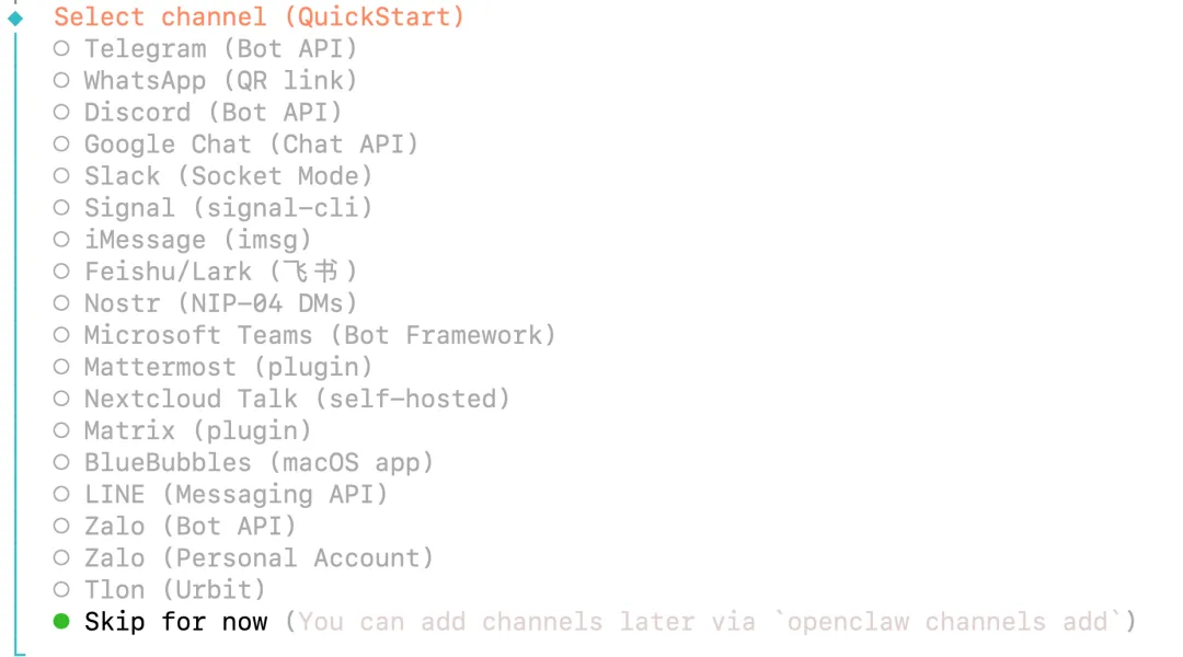 第四步:配置通道(跳过,使用WebUI访问,后续根据实际情况配置通道)