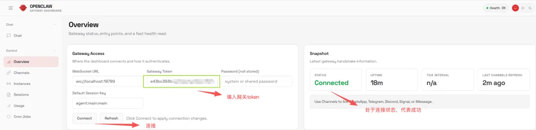 正常访问需输入网关令牌,默认存储在~/.openclaw/openclaw.json文件gateway.auth.token字段中