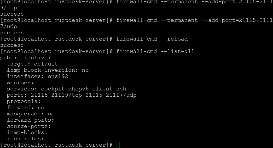 2.3防火墙配置AnolisOS-8.x默认使用的是firewall作为防火墙firewall-cmd --list-all #显示所有规则(含服务、端口、区域)systemctl status firewalld #检查 firewalld 状态rustdesk服务需要的端口如下:hbbs组件:ID 注册服务器(监听 TCP/UDP 21115、TCP/UDP 21116)hbbr组件:中继服务器(监听 TCP/UDP 21117、TCP 21118、TCP 21119)写在一起就是:TCP:21115、21116、21117、21118、21119UDP:21115、21116、21117#开放端口firewall-cmd --permanent --add-port=21115-21119/tcpfirewall-cmd --permanent --add-port=21115-21117/udpfirewall-cmd --reload #重新加载防火墙配置firewall-cmd --list-all #显示所有规则