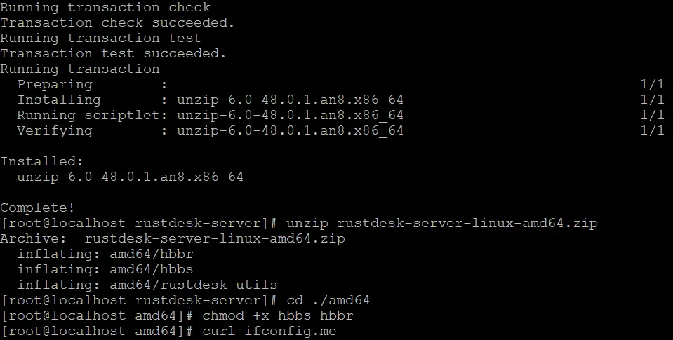 cd /data/server/rustdesk-serveryum -y install unzip #安装解压缩工具unzip rustdesk-server-linux-amd64.zipcd ./amd64chmod +x hbbs hbbr #添加执行权限curl ifconfig.me #获取公网ip地址