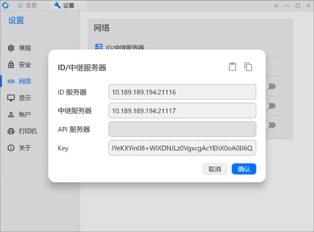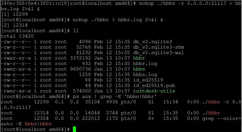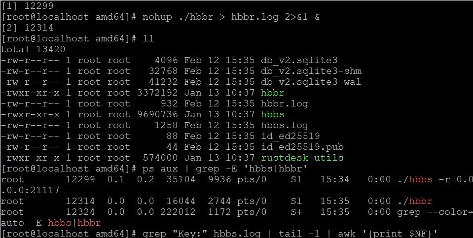 #启动rustdesk-servercd /data/server/rustdesk-server/amd64nohup ./hbbs -r 0.0.0.0:21117 > hbbs.log 2>&1 & #这里的 21117 是 hbbr 的端口,hbbs的端口是21116nohup ./hbbr > hbbr.log 2>&1 & #默认监听 21117(TCP/UDP)#查看进程ps aux | grep -E 'hbbs|hbbr'#获取apigrep "Key:" hbbs.log | tail -1 | awk '{print $NF}'# 结束 hbbs 和 hbbr 进程pkill -f hbbspkill -f hbbr