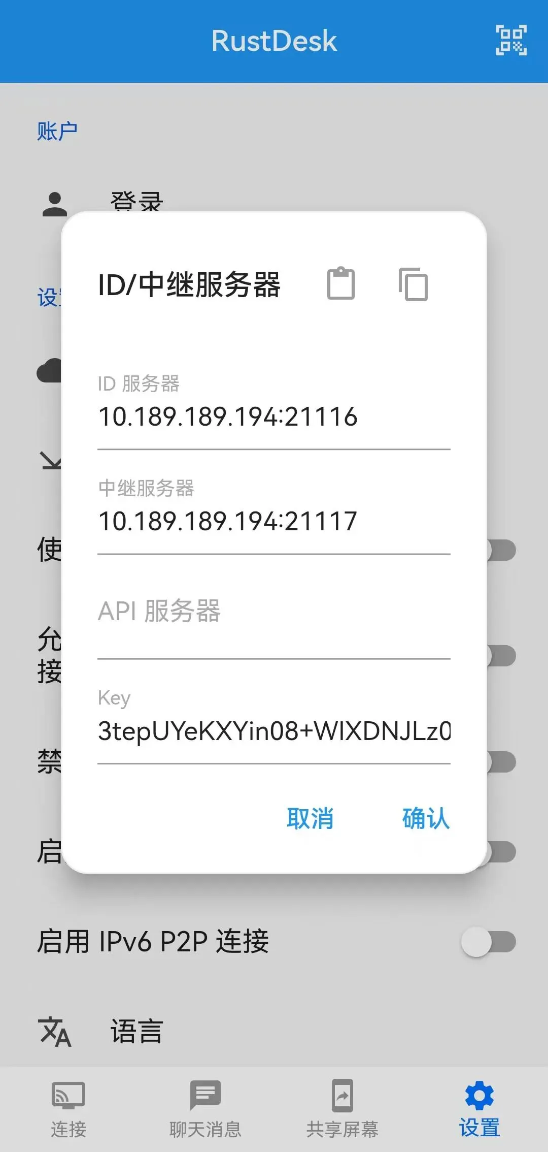打开Rust Client设置页面-网络-解锁网络设置ID服务器:填入 10.189.189.194:21116中继服务器:填入 10.189.189.194:21117安卓rustdesk-1.4.5-aarch64-signed.apk至此,Linux系统下RustDesk自建服务器教程完成。