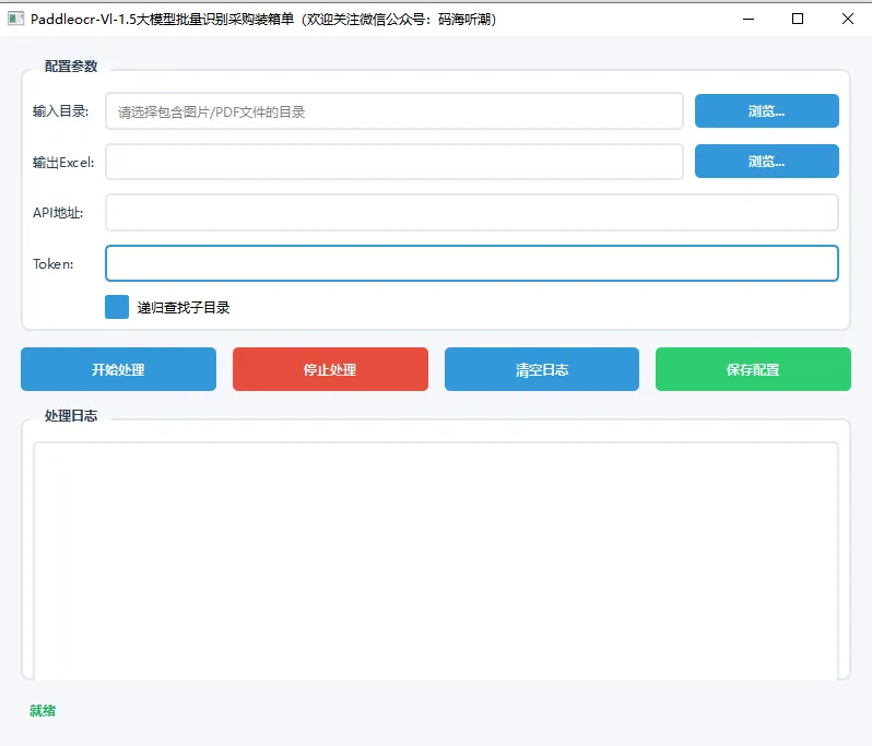 import sysimport osimport jsonfrom PyQt6.QtWidgets import (QApplication, QMainWindow, QWidget, QVBoxLayout, QHBoxLayout, QPushButton, QLabel, QLineEdit, QTextEdit, QFileDialog, QMessageBox, QGroupBox, QGridLayout, QCheckBox)from PyQt6.QtCore import Qtfrom PyQt6.QtGui import QTextCursorclass Config: """配置管理类""" CONFIG_FILE = "config.json" @classmethod def load(cls): """加载配置""" default_config = { "api_url": "", "token": "", "recursive": True, "output_file": "采购装箱单提取结果.xlsx" } try: if os.path.exists(cls.CONFIG_FILE): with open(cls.CONFIG_FILE, 'r', encoding='utf-8') as f: config = json.load(f) for key in default_config: if key not in config: config[key] = default_config[key] return config except Exception as e: print(f"加载配置文件失败: {e}") return default_config @classmethod def save(cls, api_url, token, recursive, output_file): """保存配置""" try: config = { "api_url": api_url, "token": token, "recursive": recursive, "output_file": output_file } with open(cls.CONFIG_FILE, 'w', encoding='utf-8') as f: json.dump(config, f, ensure_ascii=False, indent=2) return True except Exception as e: print(f"保存配置文件失败: {e}") return Falseclass MainWindow(QMainWindow): """主窗口""" def __init__(self): super().__init__() self.config = Config.load() self.init_ui() def init_ui(self): """初始化UI""" self.setWindowTitle("采购装箱单信息提取工具(欢迎关注微信公众号:码海听潮)") self.setMinimumSize(800, 650) self.setStyleSheet(""" QMainWindow { background-color: #f5f7fa; } QGroupBox { font-weight: bold; border: 2px solid #e1e9f0; border-radius: 8px; margin-top: 10px; padding-top: 10px; background-color: white; } QGroupBox::title { subcontrol-origin: margin; left: 10px; padding: 0 10px 0 10px; color: #2c3e50; } QPushButton { background-color: #3498db; color: white; border: none; padding: 8px 16px; border-radius: 5px; font-weight: bold; min-width: 100px; } QPushButton:hover { background-color: #2980b9; } QPushButton:pressed { background-color: #1c6ea4; } QPushButton:disabled { background-color: #bdc3c7; } QLineEdit { padding: 8px; border: 2px solid #e1e9f0; border-radius: 5px; background-color: white; selection-background-color: #3498db; } QLineEdit:focus { border-color: #3498db; } QTextEdit { border: 2px solid #e1e9f0; border-radius: 5px; background-color: white; font-family: Consolas, Monaco, monospace; font-size: 12px; } QCheckBox { spacing: 8px; } QCheckBox::indicator { width: 18px; height: 18px; border: 2px solid #e1e9f0; border-radius: 3px; background-color: white; } QCheckBox::indicator:checked { background-color: #3498db; border-color: #3498db; } QLabel { color: #2c3e50; } """) central_widget = QWidget() self.setCentralWidget(central_widget) main_layout = QVBoxLayout(central_widget) main_layout.setSpacing(15) main_layout.setContentsMargins(20, 20, 20, 20) config_group = QGroupBox("配置参数") config_layout = QGridLayout(config_group) config_layout.setVerticalSpacing(12) config_layout.setHorizontalSpacing(10) config_layout.addWidget(QLabel("输入目录:"), 0, 0) self.input_dir_edit = QLineEdit() self.input_dir_edit.setPlaceholderText("请选择包含图片/PDF文件的目录") config_layout.addWidget(self.input_dir_edit, 0, 1) self.browse_input_btn = QPushButton("浏览...") self.browse_input_btn.clicked.connect(self.browse_input_dir) self.browse_input_btn.setFixedWidth(80) config_layout.addWidget(self.browse_input_btn, 0, 2) config_layout.addWidget(QLabel("输出Excel:"), 1, 0) self.output_file_edit = QLineEdit() self.output_file_edit.setText(self.config.get("output_file", "采购单提取结果.xlsx")) config_layout.addWidget(self.output_file_edit, 1, 1) self.browse_output_btn = QPushButton("浏览...") self.browse_output_btn.clicked.connect(self.browse_output_file) self.browse_output_btn.setFixedWidth(80) config_layout.addWidget(self.browse_output_btn, 1, 2) config_layout.addWidget(QLabel("API地址:"), 2, 0) self.api_url_edit = QLineEdit() self.api_url_edit.setText(self.config.get("api_url", "https://38.com/layout-parsing")) config_layout.addWidget(self.api_url_edit, 2, 1, 1, 2) config_layout.addWidget(QLabel("Token:"), 3, 0) self.token_edit = QLineEdit() self.token_edit.setText(self.config.get("token", "db65aec850709aa083c4")) self.token_edit.setEchoMode(QLineEdit.EchoMode.Password) config_layout.addWidget(self.token_edit, 3, 1, 1, 2) self.recursive_checkbox = QCheckBox("递归查找子目录") self.recursive_checkbox.setChecked(self.config.get("recursive", True)) config_layout.addWidget(self.recursive_checkbox, 4, 1) main_layout.addWidget(config_group) button_layout = QHBoxLayout() button_layout.setSpacing(15) self.start_btn = QPushButton("开始处理") self.start_btn.setMinimumHeight(40) self.start_btn.clicked.connect(self.start_processing) button_layout.addWidget(self.start_btn) self.clear_btn = QPushButton("清空日志") self.clear_btn.setMinimumHeight(40) self.clear_btn.clicked.connect(self.clear_log) button_layout.addWidget(self.clear_btn) self.save_config_btn = QPushButton("保存配置") self.save_config_btn.setMinimumHeight(40) self.save_config_btn.clicked.connect(self.save_configuration) self.save_config_btn.setStyleSheet("background-color: #2ecc71;") button_layout.addWidget(self.save_config_btn) main_layout.addLayout(button_layout) log_group = QGroupBox("处理日志") log_layout = QVBoxLayout(log_group) self.log_text = QTextEdit() self.log_text.setReadOnly(True) self.log_text.setMinimumHeight(350) log_layout.addWidget(self.log_text) main_layout.addWidget(log_group) self.status_label = QLabel("就绪") self.status_label.setStyleSheet("color: #27ae60; font-weight: bold; padding: 5px;") main_layout.addWidget(self.status_label) def browse_input_dir(self): """浏览输入目录""" directory = QFileDialog.getExistingDirectory( self, "选择输入目录", "", QFileDialog.Option.ShowDirsOnly ) if directory: self.input_dir_edit.setText(directory.replace('/', '\\')) def browse_output_file(self): """浏览