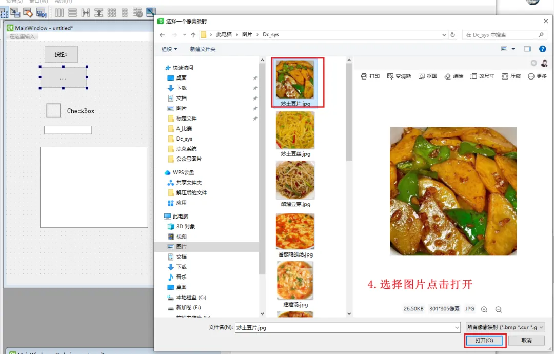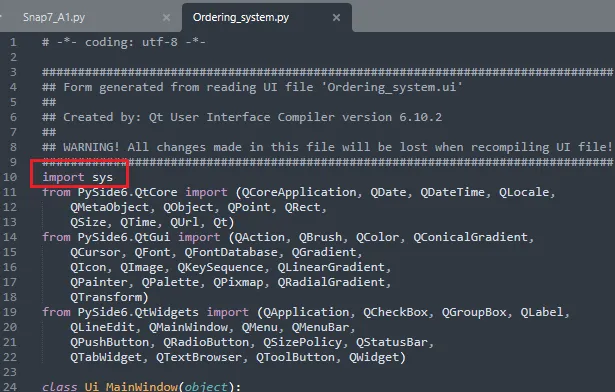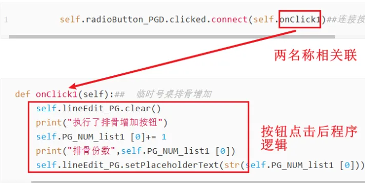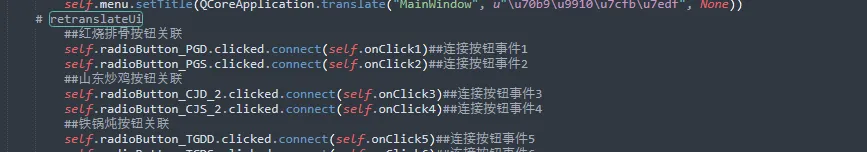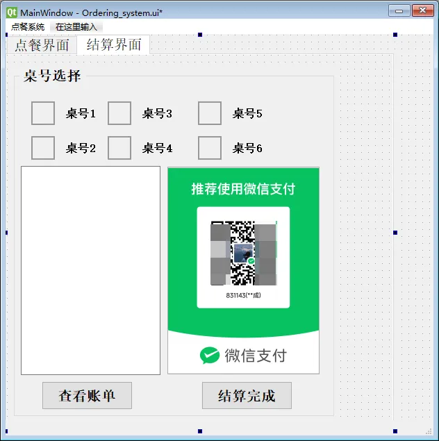##红烧排骨按钮关联 self.radioButton_PGD.clicked.connect(self.onClick1)##连接按钮事件1 self.radioButton_PGS.clicked.connect(self.onClick2)##连接按钮事件2 ##山东炒鸡按钮关联 self.radioButton_CJD_2.clicked.connect(self.onClick3)##连接按钮事件3 self.radioButton_CJS_2.clicked.connect(self.onClick4)##连接按钮事件4 ##铁锅炖按钮关联 self.radioButton_TGDD.clicked.connect(self.onClick5)##连接按钮事件5 self.radioButton_TGDS.clicked.connect(self.onClick6)##连接按钮事件6 ##红烧肉按钮关联 self.radioButton_HSRD.clicked.connect(self.onClick7)##连接按钮事件7 self.radioButton_HSRS.clicked.connect(self.onClick8)##连接按钮事件8 ##炒土豆丝按钮关联 self.radioButton_TDSD.clicked.connect(self.onClick9)##连接按钮事件9 self.radioButton_TDSS.clicked.connect(self.onClick10)##连接按钮事件10 ##呛藕片按钮关联 self.radioButton_COPD.clicked.connect(self.onClick11)##连接按钮事件11 self.radioButton_COPS.clicked.connect(self.onClick12)##连接按钮事件12 ##炒土豆片按钮关联 self.radioButton_TDPD.clicked.connect(self.onClick13)##连接按钮事件13 self.radioButton_TDPS.clicked.connect(self.onClick14)##连接按钮事件14 ##醋溜豆芽按钮关联 self.radioButton_DYD.clicked.connect(self.onClick15)##连接按钮事件15 self.radioButton_DYS.clicked.connect(self.onClick16)##连接按钮事件16 ##疙瘩汤按钮关联 self.radioButton_GDTD.clicked.connect(self.onClick17)##连接按钮事件17 self.radioButton_GDTS.clicked.connect(self.onClick18)##连接按钮事件18 ##番茄汤按钮关联 self.radioButton_FQTD.clicked.connect(self.onClick19)##连接按钮事件19 self.radioButton_FQTS.clicked.connect(self.onClick20)##连接按钮事件20 ##米饭按钮关联 self.radioButton_MFD.clicked.connect(self.onClick21)##连接按钮事件21 self.radioButton_MFS.clicked.connect(self.onClick22)##连接按钮事件22 ##面条按钮关联 self.radioButton_MTD.clicked.connect(self.onClick23)##连接按钮事件23 self.radioButton_MTS.clicked.connect(self.onClick24)##连接按钮事件24 ##下单按钮关联 self.pushButton.clicked.connect(self.onClick25)##连接按钮事件25 ##查看账单按钮关联 self.pushButton_CKZD.clicked.connect(self.onClick26)##连接按钮事件26 ##结算按钮关联 self.pushButton_JSWC.clicked.connect(self.onClick27)##连接按钮事件27# ------------------- 新增的窗口调用逻辑 -------------------class MainWindow(QMainWindow, Ui_MainWindow): def __init__(self, parent=None): super().__init__(parent) # 这个变量属于整个窗口实例,不会每次点击都重置 ## 0-代表红烧排骨份数 1-代表山东炒鸡 2-代表红烧肉 3---依次类推 self.PG_NUM_list0 = (0,0,0,0,0,0,0,0,0,0,0,0) # 空列表用于清空值 self.PG_NUM_list1 = [0,0,0,0,0,0,0,0,0,0,0,0] # 临时号桌菜单记录列表0-11 self.PG_NUM_list2 = [0,0,0,0,0,0,0,0,0,0,0,0] # 1号桌菜单记录列表0-11 self.PG_NUM_list3 = [0,0,0,0,0,0,0,0,0,0,0,0] # 2号桌菜单记录列表0-11 self.PG_NUM_list4 = [0,0,0,0,0,0,0,0,0,0,0,0] # 3号桌菜单记录列表0-11 self.PG_NUM_list5 = [0,0,0,0,0,0,0,0,0,0,0,0] # 4号桌菜单记录列表0-11 self.PG_NUM_list6 = [0,0,0,0,0,0,0,0,0,0,0,0] # 5号桌菜单记录列表0-11 self.PG_NUM_list7 = [0,0,0,0,0,0,0,0,0,0,0,0] # 6号桌菜单记录列表0-11 self.PG_NUM_list8 = [0,0,0,0,0,0,0,0,0,0,0,0] # 临时号桌菜单查询列表0-11 # 加载UI界面 self.setupUi(self) ##排骨 def onClick1(self):## 临时号桌排骨增加 self.lineEdit_PG.clear() print("执行了排骨增加按钮") self.PG_NUM_list1 [0]+= 1 print("排骨份数",self.PG_NUM_list1 [0]) self.lineEdit_PG.setPlaceholderText(str(self.PG_NUM_list1 [0])) def onClick2(self):## 临时号桌桌排骨减少 self.lineEdit_PG.clear() if self.PG_NUM_list1 [0]-1>=0 : print("执行了排骨减少按钮") self.PG_NUM_list1 [0]-= 1 print("排骨份数",self.PG_NUM_list1 [0]) self.lineEdit_PG.setPlaceholderText(str(self.PG_NUM_list1 [0])) ##炒鸡 def onClick3(self):## 临时号桌炒鸡增加 self.lineEdit_CJ_2.clear() print("执行了炒鸡增加按钮") self.PG_NUM_list1 [1]+= 1 print("炒鸡份数",self.PG_NUM_list1 [1]) self.lineEdit_CJ_2.setPlaceholderText(str(self.PG_NUM_list1 [1])) def onClick4(self):## 临时号桌炒鸡减少 self.lineEdit_CJ_2.clear() if self.PG_NUM_list1 [1]-1>=0 : print("执行了炒鸡减少按钮") self.PG_NUM_list1 [1]-= 1 print("炒鸡份数",self.PG_NUM_list1 [1]) self.lineEdit_CJ_2.setPlaceholderText(str(self.PG_NUM_list1 [1])) ##铁锅炖 def onClick5(self):## 临时号桌铁锅炖增加 self.lineEdit_TGD.clear() print("执行了铁锅炖增加按钮") self.PG_NUM_list1 [2]+= 1 print("铁锅炖份数",self.PG_NUM_list1 [2]) self.lineEdit_TGD.setPlaceholderText(str(self.PG_NUM_list1 [2])) def onClick6(self):## 临时号桌铁锅炖减少 self.lineEdit_TGD.clear() if self.PG_NUM_list1 [2]-1>=0 : print("执行了铁锅炖减少按钮") self.PG_NUM_list1 [2]-= 1 print("铁锅炖份数",self.PG_NUM_list1 [2]) self.lineEdit_TGD.setPlaceholderText(str(self.PG_NUM_list1 [2])) ##红烧肉 def onClick7(self):## 临时号桌桌红烧肉增加 self.lineEdit_HSR.clear() print("执行了红烧肉增加按钮") self.PG_NUM_list1 [3]+= 1 print("红烧肉份数",self.PG_NUM_list1 [3]) self.lineEdit_HSR.setPlaceholderText(str(self.PG_NUM_list1 [3])) def onClick8(self):## 临时号桌红烧肉减少 self.lineEdit_HSR.clear() if self.PG_NUM_list1 [3]-1>=0 : print("执行了红烧肉减少按钮") self.PG_NUM_list1 [3]-= 1 print("红烧肉份数",self.PG_NUM_list1 [3]) self.lineEdit_HSR.setPlaceholderText(str(self.PG_NUM_list1 [3])) ##炒土豆丝 def onClick9(self):## 临时号桌炒土豆丝增加 self.lineEdit_TDS.clear() print("执行了炒土豆丝增加按钮") self.PG_NUM_list1 [4]+= 1 print("炒土豆丝份数",self.PG_NUM_list1 [4]) self.lineEdit_TDS.setPlaceholderText(str(self.PG_NUM_list1 [4])) def onClick10(self):## 临时号桌炒土豆丝减少 self.lineEdit_TDS.clear() if self.PG_NUM_l