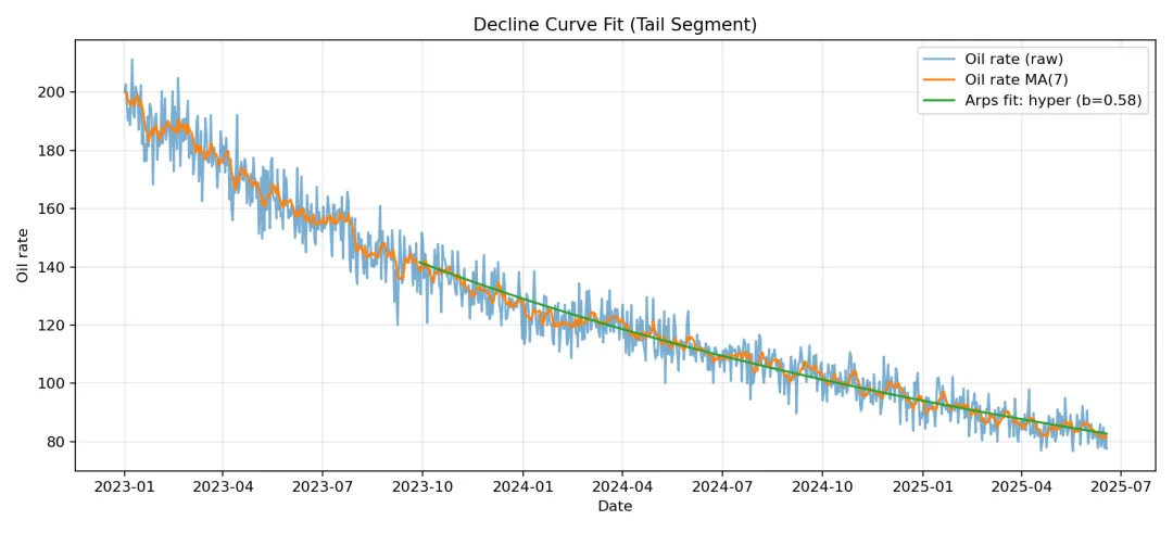 注意:递减分析更适用于相对稳定制度下的生产段。脚本会默认用“后段数据”拟合,避免早期爬坡干扰。