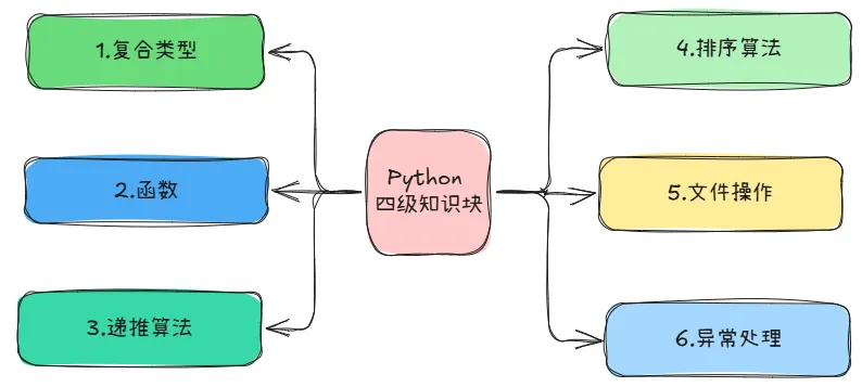 掌握Python复合类型的嵌套使用。通过函数相关知识的学习,掌握模块化设计思想,具备编写自定义函数程序的能力。掌握文件读写操作,并通过对排序算法、递推法的学习,可以根据不同的使用场景,合理选择最优的算法。
