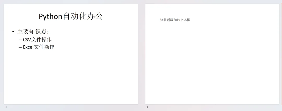from pptx import Presentationfrom pptx.util import Inches, Ptfrom pptx.enum.text import PP_ALIGNfrom pptx.dml.color import RGBColor# 创建演示文稿prs = Presentation()# 选择布局(0是标题幻灯片,1是标题和内容,等等)slide_layout = prs.slide_layouts[1]slide = prs.slides.add_slide(slide_layout)# 设置标题title = slide.shapes.titletitle.text = "Python自动化办公"# 设置内容content = slide.placeholders[1]text_frame = content.text_frametext_frame.text = "主要知识点:"# 添加项目符号p = text_frame.add_paragraph()p.text = "CSV文件操作"p.level = 1 # 缩进级别p = text_frame.add_paragraph()p.text = "Excel文件操作"p.level = 1# 添加新幻灯片slide2 = prs.slides.add_slide(prs.slide_layouts[5]) # 空白幻灯片left = top = Inches(1)width = Inches(8)height = Inches(1)# 添加文本框txBox = slide2.shapes.add_textbox(left, top, width, height)tf = txBox.text_frametf.text = "这是新添加的文本框"# 保存prs.save('output.pptx')
