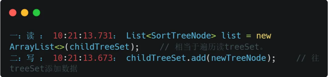 业务场景是转发场景,服务接收新转发feed消息,把feed加载到转发树中。 其中树节点的子节点集合使用的数据结构正是TreeSet,方便子节点去重排序和二分快速查找。