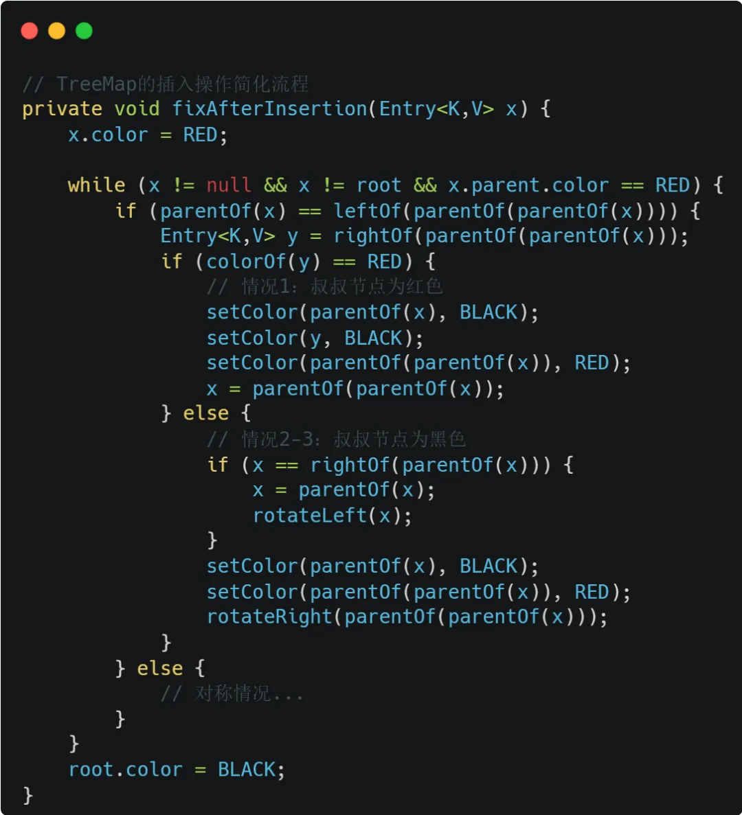 reeMap 的fixAfterInsertion就是为了在插入新节点后,通过颜色修改和旋转恢复这些规则。如果执行到一半被打断,树结构会违反上述规则,形成 “不一致状态”。