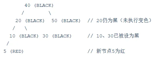 缺失节点:遍历到20时,因黑高异常,遍历逻辑提前终止,导致30、50等节点无法被遍历到;