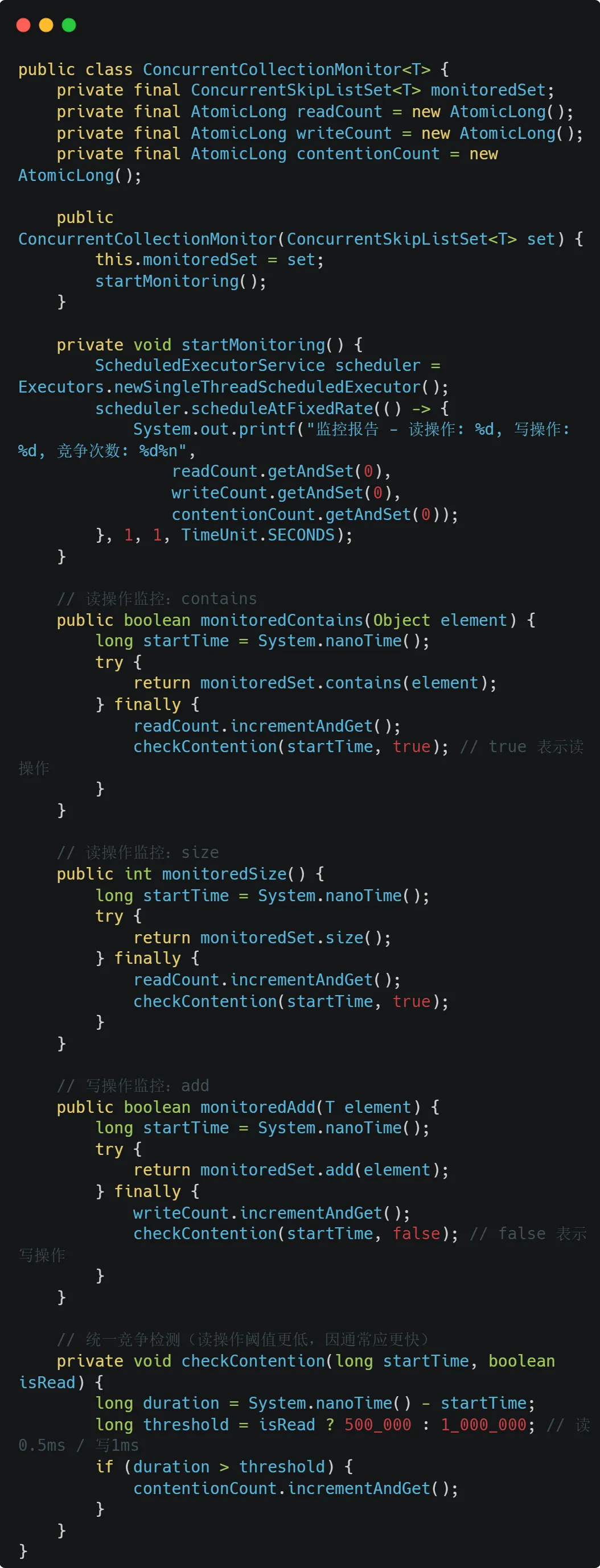 所以在高并发场景下可以直接使用ConcurrentSkipListSet,如果需要顺便加上一个监控诊断: