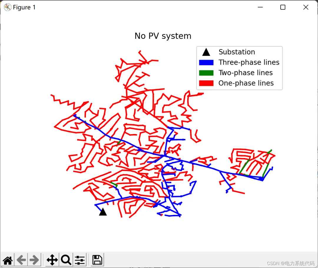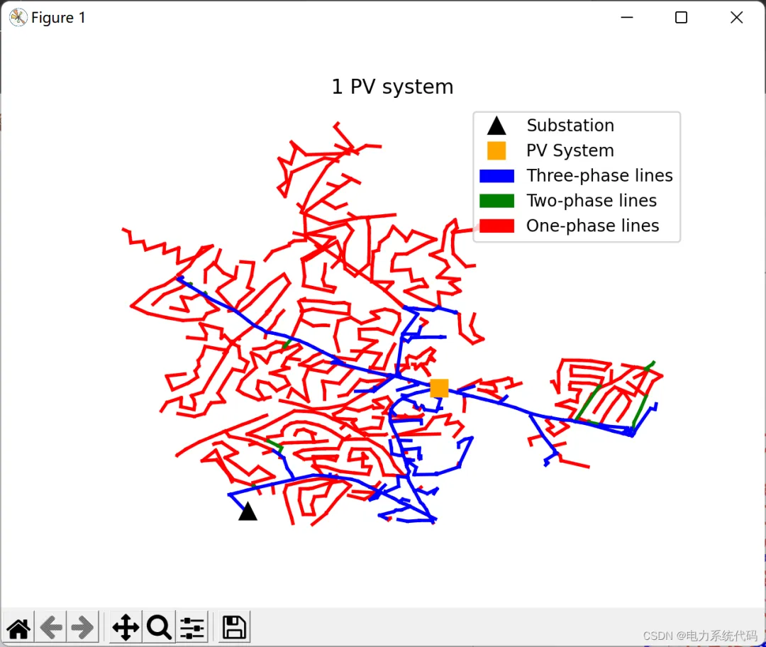 def plot_5_pv(): ckt24_plot() substation, = pylab.plot([11735514.42],[3709460.816],'k^', markersize=10, label='Substation') pvsyst, = pylab.plot( [11740361.09,11745683.27,11740622.95,11740594.66,11735219.81], [3709237.782,3712746.259,3714771.12,3718243.191,3718067.52], color='orange', marker='s', markersize=10, linestyle='None', label='PV System') blue_patch = mpatches.Patch(color='blue', label='Three-phase lines') green_patch = mpatches.Patch(color='green', label='Two-phase lines') red_patch = mpatches.Patch(color='red', label='One-phase lines') pylab.legend(handles=[substation, pvsyst, blue_patch, green_patch, red_patch]) pylab.title("5 PV systems") pylab.show()def plot_5_pv():