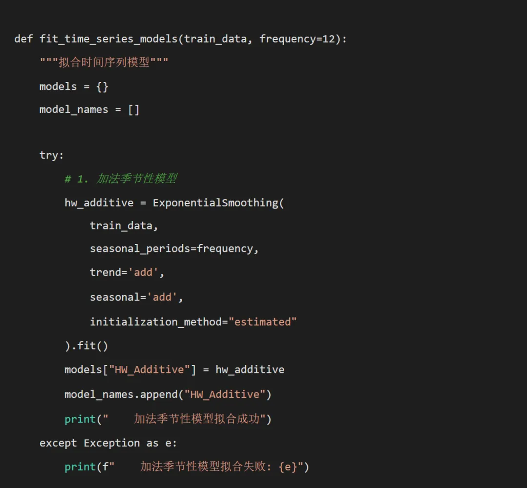 # pip install pandas numpy matplotlib seaborn statsmodels scikit-learn joblibimport osimport pandas as pdimport numpy as npimport matplotlib.pyplot as pltimport seaborn as snsfrom datetime import datetime, timedeltaimport warningswarnings.filterwarnings('ignore')# 时间序列分析相关库from statsmodels.tsa.holtwinters import ExponentialSmoothingfrom statsmodels.tsa.seasonal import seasonal_decomposefrom statsmodels.tsa.stattools import acffrom statsmodels.tsa.arima.model import ARIMAfrom sklearn.metrics import mean_squared_error, mean_absolute_error, r2_scoreimport joblib# 设置中文字体plt.rcParams['font.sans-serif'] = ['SimHei', 'Microsoft YaHei', 'DejaVu Sans']plt.rcParams['axes.unicode_minus'] = Falsedef get_desktop_path():"""获取桌面路径"""return os.path.join(os.path.expanduser("~"), "Desktop")def create_directories(base_path):"""创建必要的目录结构""" directories = ["Models","Predictions","Plots","Residuals_Analysis","Decomposition" ]for directory in directories: dir_path = os.path.join(base_path, directory)if not os.path.exists(dir_path): os.makedirs(dir_path)print(f"创建目录: {dir_path}")def prepare_time_series(data, disease_col, date_col='timestamp'):"""准备时间序列数据"""# 确保日期格式正确 data[date_col] = pd.to_datetime(data[date_col])# 创建完整的时间序列 full_dates = pd.date_range(start=data[date_col].min(), end=data[date_col].max(), freq='D') full_df = pd.DataFrame({date_col: full_dates})# 合并数据 disease_data = data[[date_col, disease_col]].merge( full_df, on=date_col, how='right' ).sort_values(date_col).reset_index(drop=True)# 处理缺失值 disease_data[disease_col] = disease_data[disease_col].interpolate(method='linear') disease_data[disease_col] = disease_data[disease_col].ffill().bfill()return disease_datadef simple_auto_arima(train_data, seasonal_period=12):"""简化的自动ARIMA实现""" best_aic = np.inf best_order = (0, 0, 0) best_model = None# 尝试一些常见的ARIMA参数组合 p_values = [0, 1, 2] d_values = [0, 1] q_values = [0, 1, 2]for p in p_values:for d in d_values:for q in q_values: try: model = ARIMA(train_data, order=(p, d, q)) fitted_model = model.fit() aic = fitted_model.aicif aic < best_aic: best_aic = aic best_order = (p, d, q) best_model = fitted_model except:continuereturn best_model, best_order, best_aic