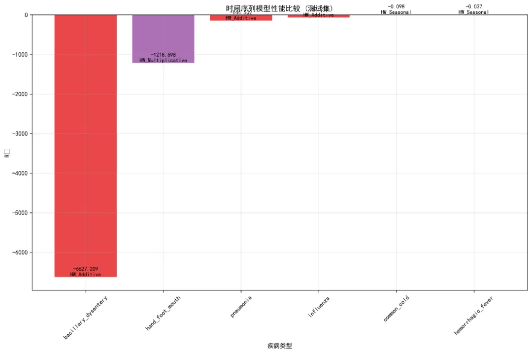 try:# 2. 乘法季节性模型if all(train_data > 0): hw_multiplicative = ExponentialSmoothing( train_data, seasonal_periods=frequency, trend='add', seasonal='mul', initialization_method="estimated" ).fit() models["HW_Multiplicative"] = hw_multiplicative model_names.append("HW_Multiplicative")print(" 乘法季节性模型拟合成功")else:print(" 数据包含零或负值,跳过乘法季节性模型") except Exception as e:print(f" 乘法季节性模型拟合失败: {e}") try:# 3. 简化的ARIMA模型 arima_model, order, aic = simple_auto_arima(train_data, frequency)if arima_model is not None: models["ARIMA"] = arima_model model_names.append("ARIMA")print(f" ARIMA模型拟合成功, order={order}, AIC={aic:.2f}") except Exception as e:print(f" ARIMA模型拟合失败: {e}") try:# 4. 简单季节性模型(无趋势) hw_seasonal = ExponentialSmoothing( train_data, seasonal_periods=frequency, trend=None, seasonal='add', initialization_method="estimated" ).fit() models["HW_Seasonal"] = hw_seasonal model_names.append("HW_Seasonal")print(" 简单季节性模型拟合成功") except Exception as e:print(f" 简单季节性模型拟合失败: {e}")return models, model_namesdef select_best_model(models, train_data):"""选择最佳模型""" best_model_name = None best_model = None best_aic = np.inffor model_name, model in models.items(): try:if model_name.startswith("HW_"):# Holt-Winters模型使用AIC aic_val = model.aicelif model_name == "ARIMA":# ARIMA模型使用AIC aic_val = model.aicelse:# 其他模型使用MSE fitted_values = model.fittedvalues if hasattr(model, 'fittedvalues') else model.predict() aic_val = np.sum((fitted_values - train_data) ** 2)if aic_val < best_aic: best_aic = aic_val best_model_name = model_name best_model = model except Exception as e:print(f" 评估模型 {model_name} 时出错: {e}")continuereturn best_model_name, best_modeldef calculate_metrics(y_true, y_pred):"""计算评估指标"""# 处理可能的NaN值 mask = ~(np.isnan(y_true) | np.isnan(y_pred)) y_true_clean = y_true[mask] y_pred_clean = y_pred[mask]if len(y_true_clean) == 0:return np.nan, np.nan, np.nan rmse = np.sqrt(mean_squared_error(y_true_clean, y_pred_clean)) mae = mean_absolute_error(y_true_clean, y_pred_clean) r2 = r2_score(y_true_clean, y_pred_clean)return rmse, mae, r2def plot_predictions(pred_df, disease, model_type, test_r2, test_rmse, save_path):"""绘制预测结果图""" fig, axes = plt.subplots(2, 2, figsize=(16, 12)) fig.suptitle(f'{disease} - 时间序列模型分析结果', fontsize=16)