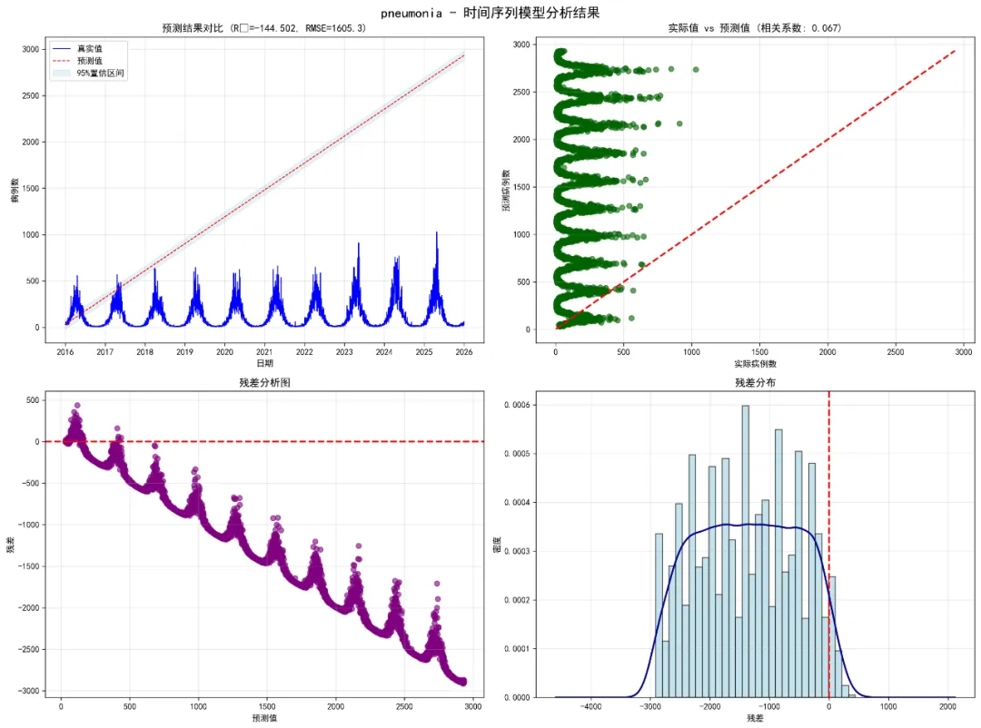 # 3. 残差分析图if'Residuals'in pred_df.columns: valid_residuals = pred_df.dropna(subset=['Predicted', 'Residuals'])if len(valid_residuals) > 0: axes[1, 0].scatter(valid_residuals['Predicted'], valid_residuals['Residuals'], alpha=0.6, color='purple') axes[1, 0].axhline(y=0, color='red', linestyle='--', linewidth=2) axes[1, 0].set_title('残差分析图') axes[1, 0].set_xlabel('预测值') axes[1, 0].set_ylabel('残差') axes[1, 0].grid(True, alpha=0.3)# 4. 残差分布图if'Residuals'in pred_df.columns: residuals_clean = pred_df['Residuals'].dropna()if len(residuals_clean) > 0: axes[1, 1].hist(residuals_clean, bins=30, density=True, alpha=0.7, color='lightblue', edgecolor='black') axes[1, 1].axvline(x=0, color='red', linestyle='--', linewidth=2)# 添加密度曲线 try: residuals_clean.plot.density(ax=axes[1, 1], color='darkblue', linewidth=2) except: pass axes[1, 1].set_title('残差分布') axes[1, 1].set_xlabel('残差') axes[1, 1].set_ylabel('密度') axes[1, 1].grid(True, alpha=0.3) plt.tight_layout() plt.savefig(os.path.join(save_path, f'{disease}_TS_Results.png'), dpi=300, bbox_inches='tight') plt.close()def plot_decomposition(train_data, disease, dates, frequency=12, save_path=None):"""绘制时间序列分解图""" try:if len(train_data) > 2 * frequency: decomposition = seasonal_decompose(train_data, model='additive', period=frequency) fig, axes = plt.subplots(4, 1, figsize=(12, 10))# 原始序列 axes[0].plot(dates, train_data, color='black', linewidth=1) axes[0].set_title('原始时间序列') axes[0].set_ylabel('病例数') axes[0].grid(True, alpha=0.3)# 趋势成分 axes[1].plot(dates, decomposition.trend, color='darkblue', linewidth=1) axes[1].set_title('趋势成分') axes[1].set_ylabel('趋势') axes[1].grid(True, alpha=0.3)# 季节性成分 axes[2].plot(dates, decomposition.seasonal, color='darkgreen', linewidth=1) axes[2].set_title('季节性成分') axes[2].set_ylabel('季节性') axes[2].grid(True, alpha=0.3)# 残差成分 axes[3].plot(dates, decomposition.resid, color='darkred', linewidth=1) axes[3].set_title('残差成分') axes[3].set_xlabel('日期') axes[3].set_ylabel('残差') axes[3].grid(True, alpha=0.3) plt.tight_layout()if save_path: plt.savefig(os.path.join(save_path, f'{disease}_Decomposition.png'), dpi=300, bbox_inches='tight') plt.close()return decomposition except Exception as e:print(f" 时间序列分解失败: {e}")return Nonedef plot_seasonal_pattern(decomposition, disease, frequency=12, save_path=None):"""绘制季节性模式图""" try:if decomposition is not None and hasattr(decomposition, 'seasonal'): seasonal_data = decomposition.seasonal[:frequency] plt.figure(figsize=(10, 6)) plt.plot(range(1, frequency + 1), seasonal_data, color='darkgreen', linewidth=2, marker='o') plt.title(f'{disease} - 季节性模式') plt.xlabel('月份'if frequency == 12 else'周期') plt.ylabel('季节性成分') plt.grid(True, alpha=0.3)if save_path: plt.savefig(os.path.join(save_path, f'{disease}_Seasonal_Pattern.png'), dpi=300, bbox_inches='tight') plt.close() except Exception as e:print(f" 季节性模式图生成失败: {e}")def plot_residual_acf(residuals, disease, save_path):"""绘制残差自相关图""" try: residuals_clean = residuals.dropna()if len(residuals_clean) > 1: acf_values = acf(residuals_clean, nlags=min(40, len(residuals_clean) - 1), fft=False) lags = range(len(acf_values)) plt.figure(figsize=(10, 6)) plt.bar(lags, acf_values, width=0.1, color='steelblue') plt.axhline(y=0, color='black') plt.axhline(y=1.96 / np.sqrt(len(residuals_clean)), color='red', linestyle='--', label='95%置信界限') plt.axhline(y=-1.96 / np.sqrt(len(residuals_clean)), color='red', linestyle='--') plt.title(f'{disease} - 残差自相关图') plt.xlabel('滞后') plt.ylabel('自相关系数') plt.legend() plt.grid(True, alpha=0.3) plt.savefig(os.path.join(save_path, f'{disease}_Residuals_ACF.png'), dpi=300, bbox_inches='tight') plt.close() except Exception as e:print(f" 残差自相关图生成失败: {e}")def main():"""主函数"""print("开始时间序列疾病预测建模...")# 设置路径 desktop_path = get_desktop_path() data_path = os.path.join(desktop_path, "Results时间", "combined_weather_disease_data.csv") results_path = os.path.join(desktop_path, "Results时间HW")# 创建目录 create_directories(results_path)# 目标疾病 target_diseases = ["influenza", "common_cold", "pneumonia","bacillary_dysentery", "hand_foot_mouth","hemorrhagic_fever" ]print(f"目标疾病: {', '.join(target_diseases)}")# 读取数据 try: combined_data = pd.read_csv(data_path) combined_data['timestamp'] = pd.to_datetime(combined_data['timestamp'])print("数据读取成功")print(f"数据时间范围: {combined_data['timestamp'].min()} 到 {combined_data['timestamp'].max()}") except Exception as e:print(f"数据读取失败: {e}")return# 存储结果 results_summary = [] predictions_list = [] models_dict = {}# 对每种疾病进行建模for disease in target_diseases:print(f"\n正在处理疾病: {disease}") try:# 检查疾病列是否存在if disease not in combined_data.columns:print(f" 疾病列 '{disease}' 不存在,跳过")continue# 准备时间序列数据 disease_data = prepare_time_series(combined_data, disease)# 划分训练集和测试集 train_data = disease_data[disease_data['timestamp'] < pd.to_datetime('2016-01-01')] test_data = disease_data[disease_data['timestamp'] >= pd.to_datetime('2016-01-01')]print(f" 训练集大小: {len(train_data)}, 测试集大小: {len(test_data)}")if len(train_data) == 0 or len(test_data) == 0:print(f" 数据不足,跳过疾病: {disease}")continue# 提取时间序列数据(使用月度频率) train_ts = train_data[disease].values test_ts = test_data[disease].values frequency = 12 # 月度频率# 拟合时间序列模型print(" 拟合时间序列模型...") models, model_names = fit_time_series_models(train_ts, frequency)if not models:print(f" 所有时间序列模型都拟合失败,跳过疾病: {disease}")continue# 选择最佳模型 be