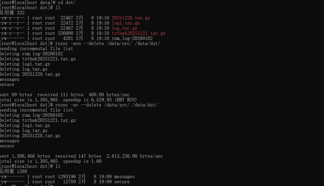 # 镜像同步(删除dst中src没有的文件,先测试再执行)rsync -avn --delete /data/src/ /data/dst/rsync -av --delete /data/src/ /data/dst/ #确认好,删除后不可恢复