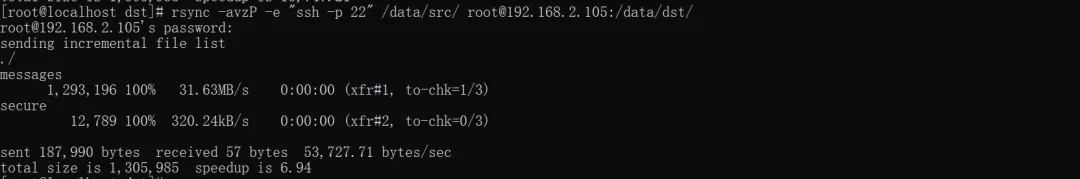 # 指定SSH端口(如远程SSH端口为22,具体以实际为准)rsync -avzP -e "ssh -p 2222" /data/src/ root@192.168.1.100:/data/dst/