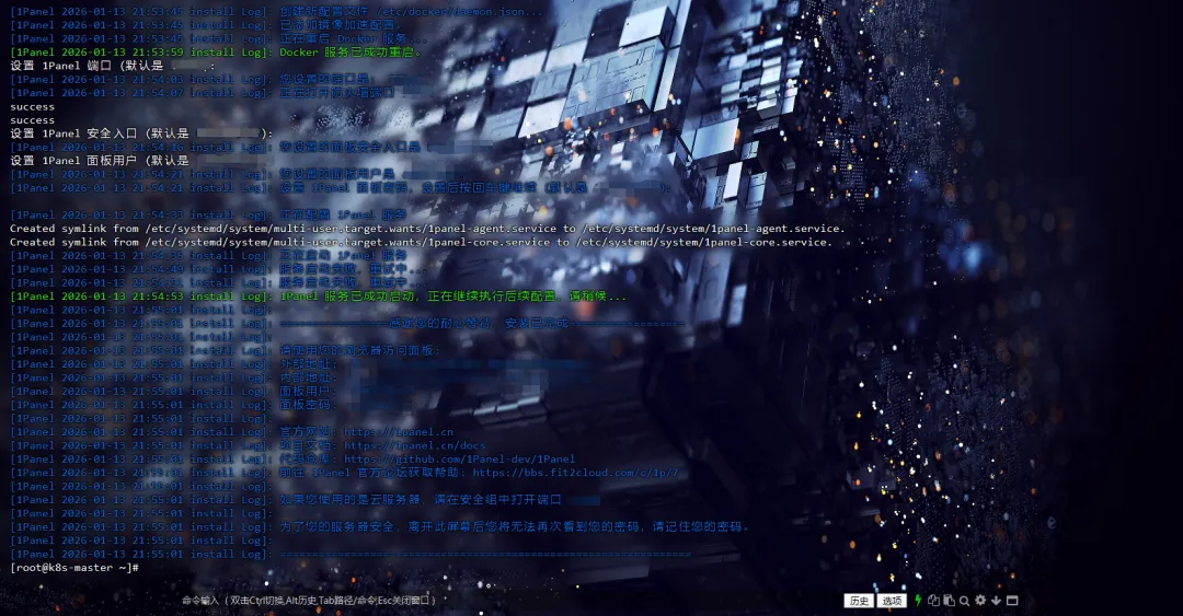 安装完成后,控制台会打印面板访问信息,外网使用外部地址访问,通过浏览器访问安装脚本提示的访问地址,复制外部地址输入面板用户名和密码即可登录,开始使用1Panel。