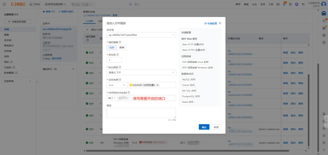 如果使用的是云服务器,请在安全组中开放对应的目标端口,这里以阿里云为例,其他云服务器亦是如此: