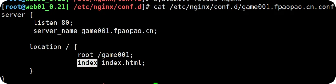 [root@web01_0.21[ /etc/nginx/conf.d]# cat mirrors.fpaopao.cn.confserver { listen 80; server_name mirrors.fpaopao.cn; location / { root /mirrors; index index.html; autoindex on; //暂时作用到loacaion层,启用或禁用目录列表输出,on开启,off关闭 }//检查并重载