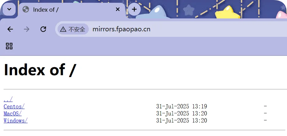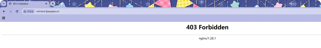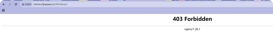 //修改hosts文件。类似DNS劫持192.168.0.21 mirrors.fpaopao.cn//创建站点目录,目前站点目录中不存在任何文件,例如index.html等;[root@web01_0.21[ /mirrors] pwd/mirrors[root@web01_0.21[ /mirrors] tree.├── Centos├── MacOS└── Windows//创建站点主配置文件[root@web01_0.21[ /etc/nginx/conf.d]# pwd/etc/nginx/conf.d[root@web01_0.21[ /etc/nginx/conf.d]# vim mirrors.fpaopao.cn.conf[root@web01_0.21[ /etc/nginx/conf.d] cat mirrors.fpaopao.cn.confserver { listen 80; server_name mirrors.fpaopao.cn; location / { root /mirrors; index index.html; }}//检查并重载[root@web01_0.21[ /mirrors]# nginx -tnginx: the configuration file /etc/nginx/nginx.conf syntax is oknginx: configuration file /etc/nginx/nginx.conf test is successful[root@web01_0.21[ /mirrors]# systemctl reload nginx目前的配置,返回 403 错误的根本原因是 location 层下的/里并没有匹配到 index 或者 index.html 文件;