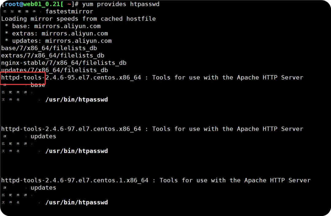 //安装httpd-tools[root@web01_0.21[ ~]# yum install -y httpd-tool[root@web01_0.21[ ~]# rpm -qa httpd-tools //有的话就不用下载了httpd-tools-2.4.6-99.el7.centos.1.x86_64//使用htpaswd,生成用户名和密码,存放在指定路径下[root@web01_0.21[ /]# htpasswd -c -b /etc/nginx/ngx.passwd fengxin 123.com!Adding password for user fengxin[root@web01_0.21[ /]# cat /etc/nginx/ngx.passwdfengxin:$apr1$libgce79$qfT1cGVR1JHgLxcpxsZ6n/ //用户名:密码,符合官方格式[root@web01_0.21[ /]# cat /etc/nginx/conf.d/mirrors.fpaopao.cn.confserver { listen 80; server_name mirrors.fpaopao.cn; charset uft-8; location / { root /mirrors; index index.html; autoindex on; autoindex_exact_size off; autoindex_localtime on;# allow 10.0.0.1/32;# deny all; auth_basic "auth"; auth_basic_user_file /etc/nginx/ngx.passwd; //指定保存用户名和密码的文件 }}//检查语法并重载htpasswd 参数详解