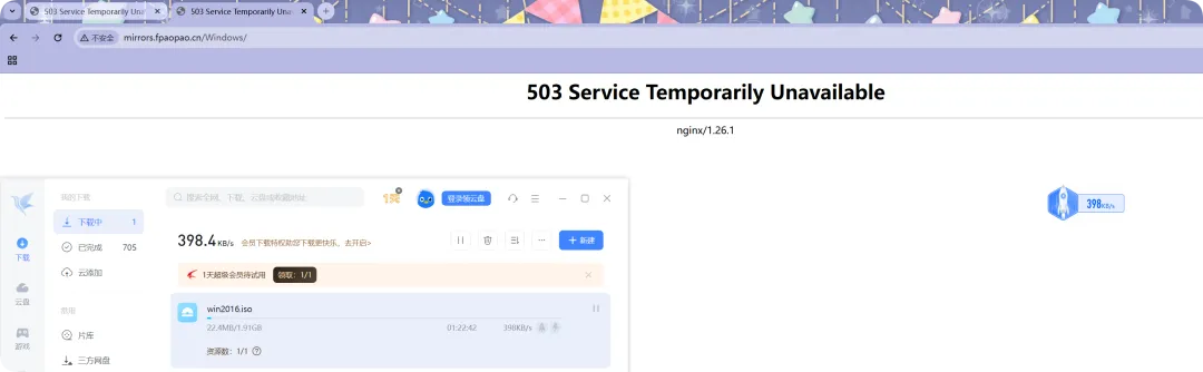 //从文件容量的200mb开始,才开始执行限速操作,执行限速为300kb/s,建议放在server层;[root@web01_0.21[ /mirrors/Windows]# cat /etc/nginx/conf.d/mirrors.fpaopao.cn.conf limit_req_zone $binary_remote_addr zone=req_one:10m rate=1r/s; limit_conn_zone $binary_remote_addr zone=conn_od:10m;server { listen 80; server_name mirrors.fpaopao.cn; charset uft-8; limit_rate 300k; //从文件容量的200mb开始,才开始执行限速操作,执行限速为300kb/s,建议放在server层; limit_rate_after 200m;# error_page 503 @temp;# location @temp {# default_type text/html;# return 200 'Please contact us at 18888888.';# } location / { root /mirrors; index index.html; autoindex on; autoindex_exact_size off; autoindex_localtime on;# allow 10.0.0.1/32;# deny all;# auth_basic "auth";# auth_basic_user_file /etc/nginx/ngx.passwd;# limit_req zone=req_one burst=5 nodelay;# limit_req_status 411;# limit_rate 200k;# limit_conn conn_od 2; }}//检查语法重载