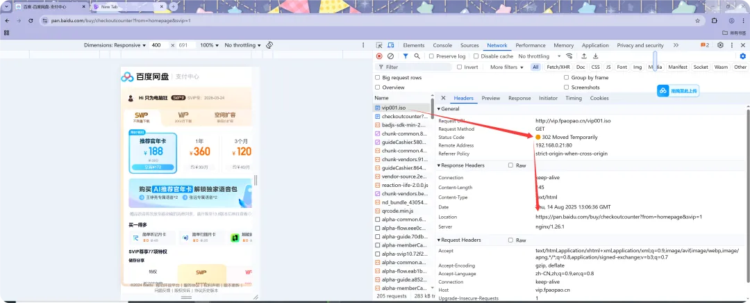 //创建站点目录[root@web01_0.21[ /etc/nginx/conf.d] mkdir /vip//站点目录中默认的首页文件,写入一些内容[root@web01_0.21[ /etc/nginx/conf.d] cd /vip/[root@web01_0.21[ /vip] echo"vip.vip.vip.vip" >index.html// DNS劫持重定向C:\Windows\System32\drivers\etc192.168.0.21 vip.fpaopao.cnC:\Users\ASUA>ping vip.fpaopao.cn正在 Ping vip.fpaopao.cn [192.168.0.21] 具有 32 字节的数据:来自 192.168.0.21 的回复: 字节=32 时间<1ms TTL=64来自 192.168.0.21 的回复: 字节=32 时间<1ms TTL=64//站点内模拟生成一个容量较大的文件[root@web01_0.21[ /vip] dd if=/dev/zero of=/vip/vip001.iso bs=2048MB count=1[root@web01_0.21[ /vip] ls -l总用量 2000004-rw-r--r-- 1 root root 16 8月 14 19:58 index.html-rw-r--r-- 1 root root 2048000000 8月 14 20:00 vip001.iso//定义vip.fengpaopao.cn站点配置文件[root@web01_0.21[ /vip] cat /etc/nginx/conf.d/vip.fpaopao.cn.conf # 定义limit_req_zone $binary_remote_addr zone=req_od01:10m rate=1r/s;limit_conn_zone $binary_remote_addr zone=conn_od01:10m;server { listen 80; server_name vip.fpaopao.cn; root /vip; limit_req zone=req_od01 burst=5 nodelay; limit_conn conn_od01 1; limit_rate 500k; limit_rate_after 100m; error_page 503 500 502 @error_temp; location @error_temp {return 302 https://pan.baidu.com/buy/checkoutcounter?from=homepage&svip=1; } location / { index index.html; }}//检查重载