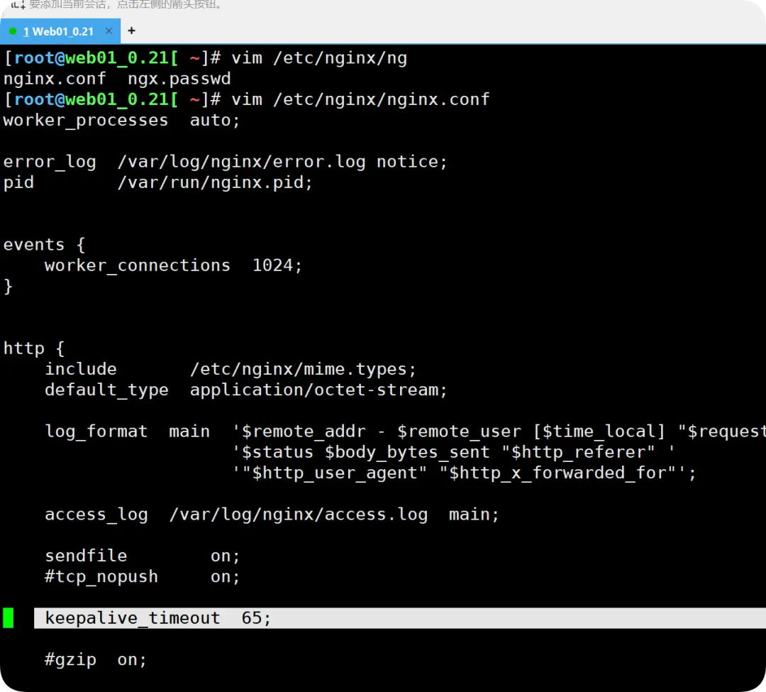 [root@web01_0.21[ /]# cat /etc/nginx/nginx.conf //查看nginx的主配置文件user nginx;worker_processes auto;error_log /var/log/nginx/error.log notice;pid /var/run/nginx.pid;events { worker_connections 1024;}http { include /etc/nginx/mime.types; default_type application/octet-stream; log_format main '$remote_addr - $remote_user [$time_local] "$request" ''$status $body_bytes_sent "$http_referer" ''"$http_user_agent" "$http_x_forwarded_for"'; access_log /var/log/nginx/access.log main; sendfile on;#tcp_nopush on; keepalive_timeout 65;#gzip on; include /etc/nginx/conf.d/*.conf; //官方文档说明该模块要加在http层。因为是被包含的关系,因此可以写在站点配置文件中}//限制请求并发数配置(指令看起来稍微复杂)[root@web01_0.21[ /]# cat /etc/nginx/conf.d/mirrors.fpaopao.cn.conf limit_req_zone $binary_remote_addr zone=req_one:10m rate=1r/s; //http标签段定义请求限制, rate限制速率,限制一秒钟 最多一个IP请求(对来源IP做限制)server { listen 80; server_name mirrors.fpaopao.cn; charset uft-8; location / { root /mirrors; index index.html; autoindex on; autoindex_exact_size off; autoindex_localtime on;# allow 10.0.0.1/32;# deny all;# auth_basic "auth";# auth_basic_user_file /etc/nginx/ngx.passwd; limit_req zone=req_one burst=5 nodelay; //调用,请求超过1r/s,剩下的将被延迟处理,请求数超过burst定义的数量,则返回503,实际的企业生产环境,不要调那么低 }}//检查重载