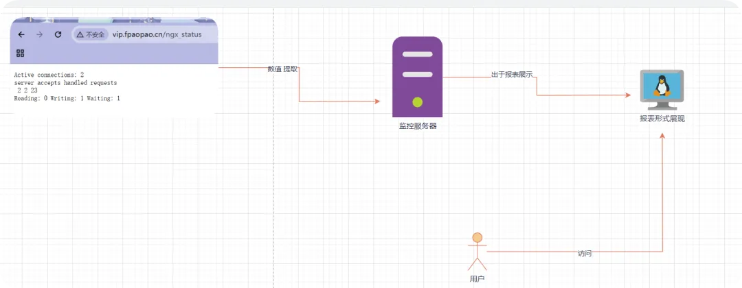 //修改站点主配置文件,允许127.0.0.1网段访问[root@web01_0.21[ ~]# cat /etc/nginx/conf.d/vip.fpaopao.cn.conf # 定义limit_req_zone $binary_remote_addr zone=req_od01:10m rate=1r/s;limit_conn_zone $binary_remote_addr zone=conn_od01:10m;server { listen 80; server_name vip.fpaopao.cn; root /vip; limit_req zone=req_od01 burst=5 nodelay; limit_req_status 411; limit_conn conn_od01 1; limit_rate 500k; limit_rate_after 100m; error_page 503 500 502 @error_temp; location @error_temp {return 302 https://pan.baidu.com/buy/checkoutcounter?from=homepage&svip=1; } location / { index index.html; } location /ngx_status { stub_status; allow 192.168.0.0/24; allow 127.0.0.1; deny all; } }//使用 curl命令携带主机头[root@web01_0.21[ ~] curl -HHost:vip.fpaopao.cn http://127.0.0.1/ngx_statusActive connections: 1 server accepts handled requests 8 8 28 Reading: 0 Writing: 1 Waiting: 0 //配合awk命令,以冒号为分隔符,取第一例最后一个数值[root@web01_0.21[ ~] curl -s -HHost:vip.fpaopao.cn http://127.0.0.1/ngx_status | awk 'NR==1 {print $NF}'1//形成友好输出提示:这就是监控需要curl命令去提取[root@web01_0.21[ ~] echo"当前nginx的活跃数:$(curl -s -HHost:vip.fpaopao.cn http://127.0.0.1/ngx_status | awk 'NR==1 {print $NF}') "当前nginx的活跃数:1