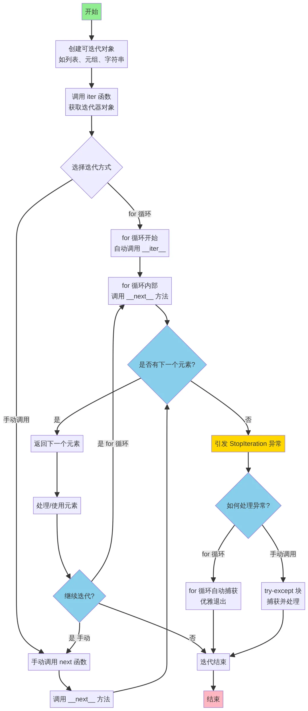 迭代结束: for 循环捕获 StopIteration 并退出。如果是手动调用,你需要自己处理这个异常。