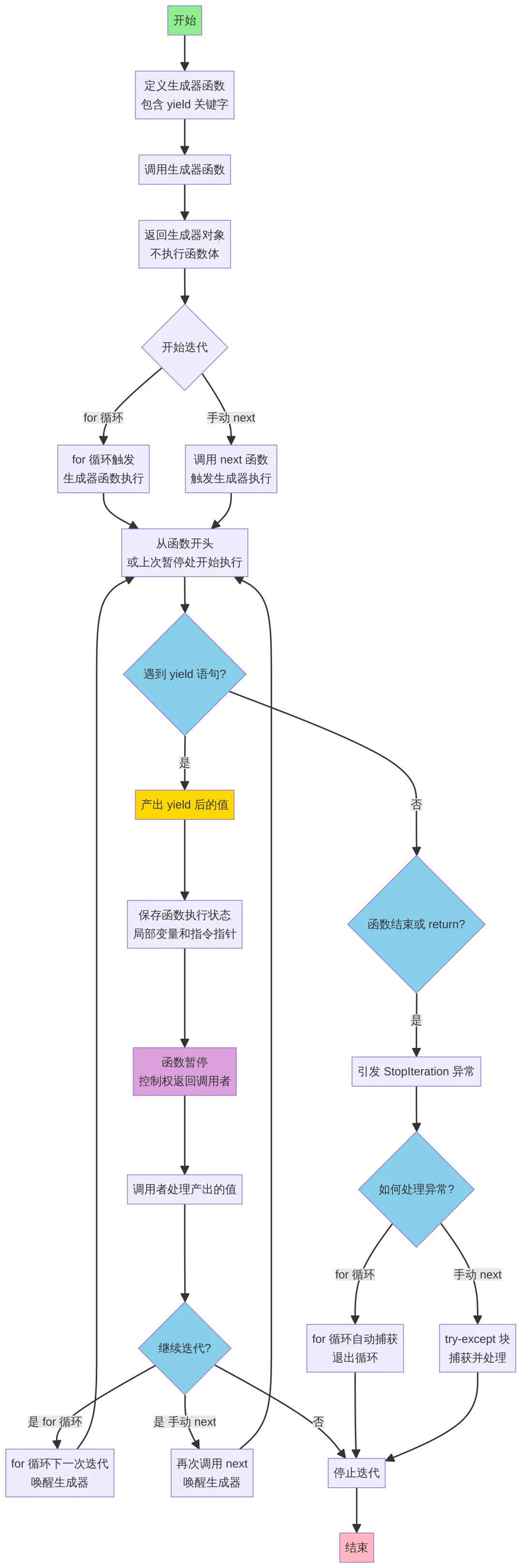 函数结束或 return: 如果函数执行到末尾,或者遇到一个 return 语句(在Python 3.3+中,生成器中的 return 会引发 StopIteration),生成器会引发一个 StopIteration 异常。