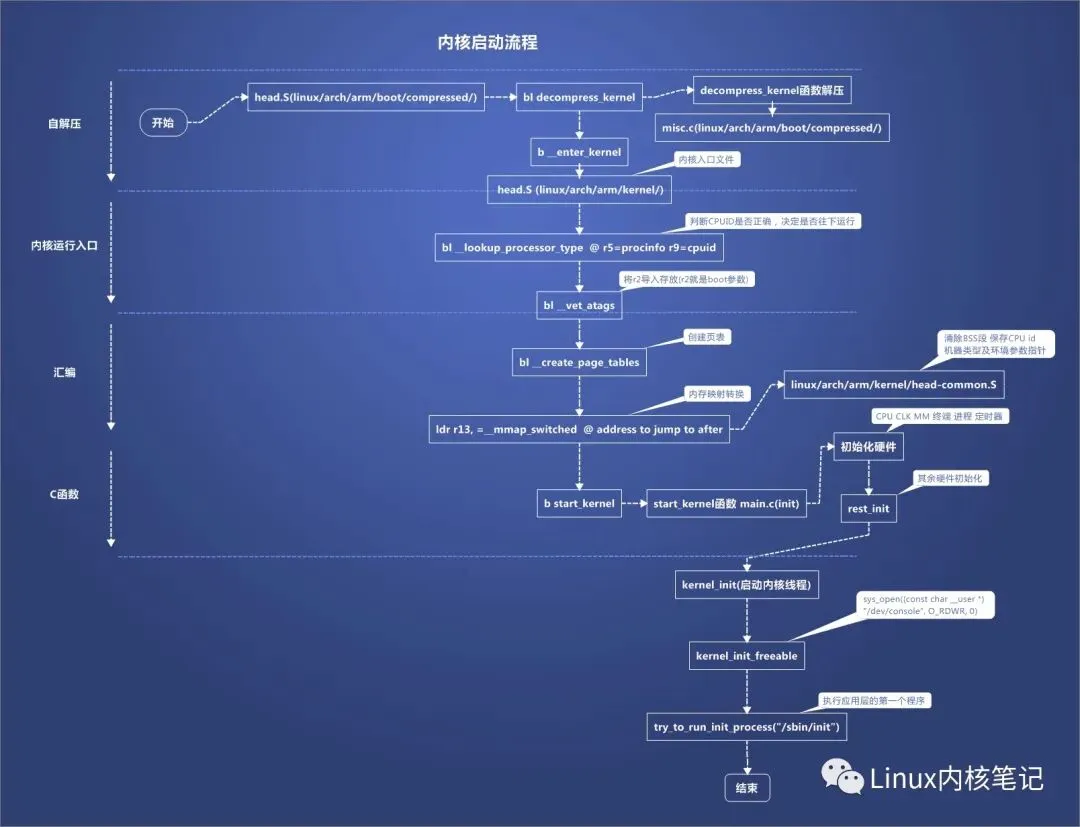 asmlinkage __visible void __init start_kernel(void){char*command_line;char*after_dashes;lockdep_init();/* lockdep 是死锁检测模块,此函数会初始化 * 两个 hash 表。此函数要求尽可能早的执行! */set_task_stack_end_magic(&init_task);/* 设置任务栈结束魔术数,*用于栈溢出检测*/smp_setup_processor_id();/* 跟 SMP 有关(多核处理器),设置处理器 ID。 * 有很多资料说 ARM 架构下此函数为空函数,那是因 * 为他们用的老版本 Linux,而那时候 ARM 还没有多 * 核处理器。*/debug_objects_early_init();/* 做一些和 debug 有关的初始化 */boot_init_stack_canary();/* 栈溢出检测初始化 */cgroup_init_early();/* cgroup 初始化,cgroup 用于控制 Linux 系统资源*/local_irq_disable();/* 关闭当前 CPU 中断 */ early_boot_irqs_disabled = true;/* * 中断关闭期间做一些重要的操作,然后打开中断 */boot_cpu_init();/* 跟 CPU 有关的初始化 */page_address_init();/* 页地址相关的初始化 */pr_notice("%s", linux_banner);/* 打印 Linux 版本号、编译时间等信息 */setup_arch(&command_line);/* 架构相关的初始化,此函数会解析传递进来的 * ATAGS 或者设备树(DTB)文件。会根据设备树里面 * 的 model 和 compatible 这两个属性值来查找 * Linux 是否支持这个单板。此函数也会获取设备树 * 中 chosen 节点下的 bootargs 属性值来得到命令 * 行参数,也就是 uboot 中的 bootargs 环境变量的* 值,获取到的命令行参数会保存到*command_line 中。 */mm_init_cpumask(&init_mm);/* 看名字,应该是和内存有关的初始化 */setup_command_line(command_line);/* 好像是存储命令行参数 */setup_nr_cpu_ids();/* 如果只是 SMP(多核 CPU)的话,此函数用于获取 * CPU 核心数量,CPU 数量保存在变量 * nr_cpu_ids 中。*/setup_per_cpu_areas();/* 在 SMP 系统中有用,设置每个 CPU 的 per-cpu 数据 */smp_prepare_boot_cpu();build_all_zonelists(NULL,NULL);/* 建立系统内存页区(zone)链表 */page_alloc_init();/* 处理用于热插拔 CPU 的页 *//* 打印命令行信息 */pr_notice("Kernel command line: %s\n", boot_command_line);parse_early_param();/* 解析命令行中的 console 参数 */ after_dashes =parse_args("Booting kernel", static_command_line, __start___param, __stop___param - __start___param,-1,-1,&unknown_bootoption);if(!IS_ERR_OR_NULL(after_dashes))parse_args("Setting init args", after_dashes,NULL,0,-1,-1, set_init_arg);jump_label_init();setup_log_buf(0);/* 设置 log 使用的缓冲区*/pidhash_init();/* 构建 PID 哈希表,Linux 中每个进程都有一个 ID, * 这个 ID 叫做 PID。通过构建哈希表可以快速搜索进程 * 信息结构体。 */vfs_caches_init_early();/* 预先初始化 vfs(虚拟文件系统)的目录项和* 索引节点缓存*/sort_main_extable();/* 定义内核异常列表 */trap_init();/* 完成对系统保留中断向量的初始化 */mm_init();/* 内存管理初始化 */sched_init();/* 初始化调度器,主要是初始化一些结构体 */preempt_disable();/* 关闭优先级抢占 */if(WARN(!irqs_disabled(),/* 检查中断是否关闭,如果没有的话就关闭中断 */"Interrupts were enabled *very* early, fixing it\n"))local_irq_disable();idr_init_cache();/* IDR 初始化,IDR 是 Linux 内核的整数管理机 * 制,也就是将一个整数 ID 与一个指针关联起来。 */rcu_init();/* 初始化 RCU,RCU 全称为 Read Copy Update(读-拷贝修改) */trace_init();/* 跟踪调试相关初始化 */context_tracking_init();radix_tree_init();/* 基数树相关数据结构初始化 */early_irq_init();/* 初始中断相关初始化,主要是注册 irq_desc 结构体变 * 量,因为 Linux 内核使用 irq_desc 来描述一个中断。 */init_IRQ();/* 中断初始化 */tick_init();/* tick 初始化 */rcu_init_nohz();init_timers();/* 初始化定时器 */hrtimers_init();/* 初始化高精度定时器 */softirq_init();/* 软中断初始化 */timekeeping_init();time_init();/* 初始化系统时间 */sched_clock_postinit();perf_event_init();profile_init();call_function_init();WARN(!irqs_disabled(),"Interrupts were enabled early\n"); early_boot_irqs_disabled = false;local_irq_enable();/* 使能中断 */kmem_cache_init_late();/* slab 初始化,slab 是 Linux 内存分配器 */console_init();/* 初始化控制台,之前 printk 打印的信息都存放 * 缓冲区中,并没有打印出来。只有调用此函数 * 初始化控制台以后才能在控制台上打印信息。 */if(panic_later)panic("Too many boot %s vars at `%s'", panic_later, panic_param);lockdep_info();/* 如果定义了宏 CONFIG_LOCKDEP,那么此函数打印一些信息。*/locking_selftest()/* 锁自测 */......page_ext_init();debug_objects_mem_init();kmemleak_init();/* kmemleak 初始化,kmemleak 用于检查内存泄漏 */setup_per_cpu_pageset();numa_policy_init();if(late_time_init)late_time_init();sched_clock_init();calibrate_delay();/* 测定 BogoMIPS 值,可以通过 BogoMIPS 来判断 CPU 的性能 * BogoMIPS 设置越大,说明 CPU 性能越好。 */pidmap_init();/* PID 位图初始化 */anon_vma_init();/* 生成 anon_vma slab 缓存 */acpi_early_init();......thread_info_cache_init();cred_init();/* 为对象的每个用于赋予资格(凭证) */fork_init();/* 初始化一些结构体以使用 fork 函数 */proc_caches_init();/* 给各种资源管理结构分配缓存 */buffer_init();/* 初始化缓冲缓存 */key_init();/* 初始化密钥 */security_init();/* 安全相关初始化 */dbg_late_init();vfs_caches_init(totalram_pages);/* 为 VFS 创建缓存 */signals_init();/* 初始化信号 */page_writeback_init();/* 页回写初始化 */proc_root_init();/* 注册并挂载 proc 文件系统 */nsfs_init();cpuset_init();/* 初始化 cpuset,cpuset 是将 CPU 和内存资源以逻辑性 * 和层次性集成的一种机制,是 cgroup 使用的子系统之一 */cgroup_init();/* 初始化 cgroup */taskstats_init_early();/* 进程状态初始化 */delayacct_init();check_bugs();/* 检查写缓冲