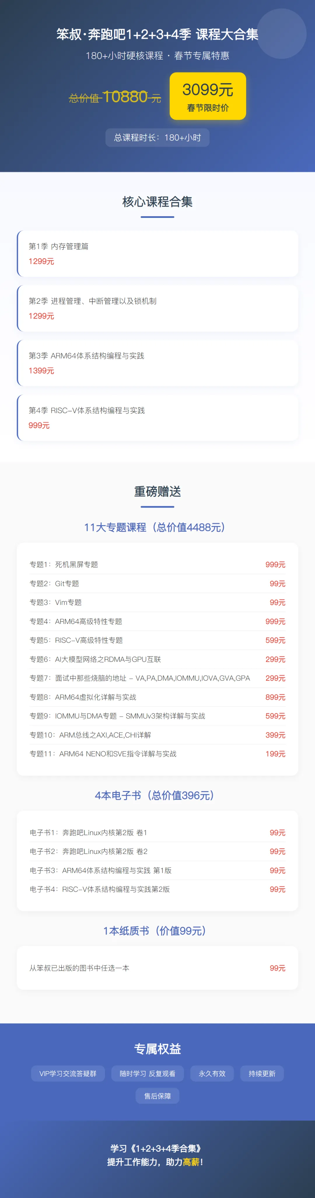 ✨Linux程序员必入|笨叔合集3099拿下10880的课✨ 作为一名计算机系统开发工程师,踩过无数坑才发现 选对课程真的能少走10年弯路‼️ 笨叔这套《奔跑吧Linux1+2+3+4季合集》真的封神了👇 ▫️4季核心课:内存管理/进程管理/ARM64/RISC-V ▫️单季原价都要999-1399,现在4季一起拿下! ✅11大专题课程(死机黑屏/ARM64高级特性/虚拟化等) ✅4本笨叔经典电子书(Linux内核/ARM64/RISC-V) 总价值足足10880元,春节特惠只要3099💰 相当于3折都不到,真的血赚! 💡我的真实感受: 笨叔的课不是那种照本宣科的水课 全是一线实战经验,讲得深入浅出 不管是想提升内核功底,还是学ARM64/RISC-V前沿技术 这套课都能直接对标职场高薪需求💸 做Linux/嵌入式/ARM开发的姐妹/兄弟 趁春节特惠闭眼冲就对了! 错过这个价格,真的要再等一年😭