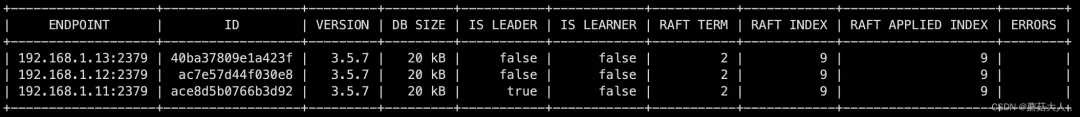 etcdctl --endpoints="192.168.1.13:2379,192.168.1.12:2379,192.168.1.11:2379" \--cacert=/etc/kubernetes/pki/etcd/etcd-ca.pem \--cert=/etc/kubernetes/pki/etcd/etcd.pem \--key=/etc/kubernetes/pki/etcd/etcd-key.pem endpoint status -w table输出如下