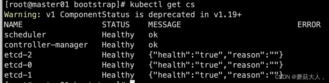 cd pkikubectl config set-cluster kubernetes --certificate-authority=/etc/kubernetes/pki/ca.pem --embed-certs=true --server=https://192.168.1.100:8443 --kubeconfig=/etc/kubernetes/bootstrap-kubelet.kubeconfigkubectl config set-credentials tls-bootstrap-token-user --token=c8ad9c.2e4d610cf3e7426e --kubeconfig=/etc/kubernetes/bootstrap-kubelet.kubeconfigkubectl config set-context tls-bootstrap-token-user@kubernetes --cluster=kubernetes --user=tls-bootstrap-token-user --kubeconfig=/etc/kubernetes/bootstrap-kubelet.kubeconfigkubectl config use-context tls-bootstrap-token-user@kubernetes --kubeconfig=/etc/kubernetes/bootstrap-kubelet.kubeconfigmkdir -p /root/.kube ; cp /etc/kubernetes/admin.kubeconfig /root/.kube/configkubectl create -f bootstrap.yaml 查看集群状态,没问题的话继续后续操作