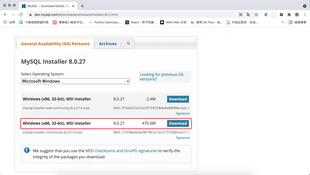 - 1. 通过官方网站提供的下载链接下载“MySQL社区版服务器”安装程序,如下图所示,建议大家下载离线安装版的MySQL Installer。