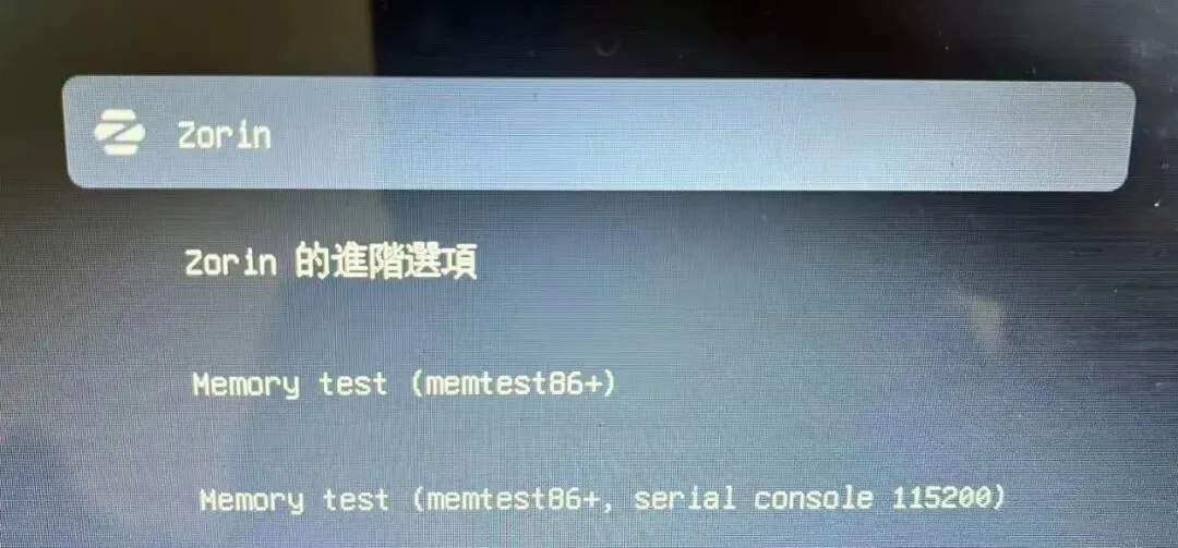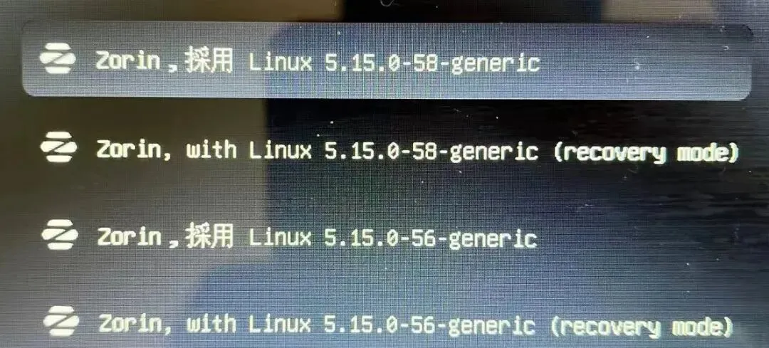 选择 Zorin,将光标停留在第一个选项即可(不用进入 recovery 模式),不用按 Enter 键,只要按一下键盘上的“e”键。