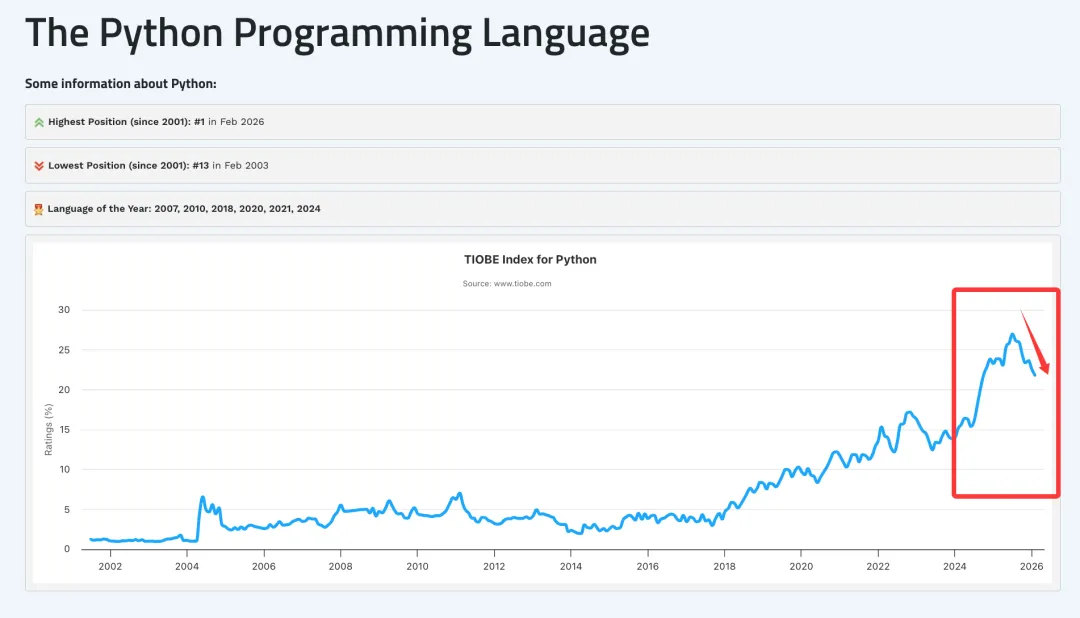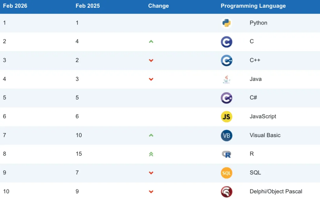TIOBE 2026 年 02 月份的编程语言排行榜已经公布,官方的标题是:领域专用语言正向 Python 发起挑战(Domain-Specific Languages Challenge Python’s Lead)。目前,Python 依然是全球最受欢迎的编程语言,其领先优势巨大,比排名第二的竞争对手高出 10 个百分点以上。