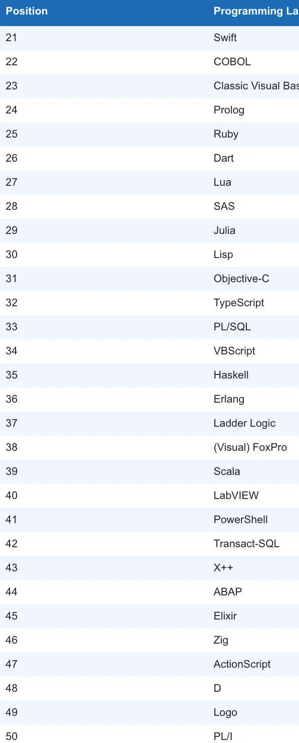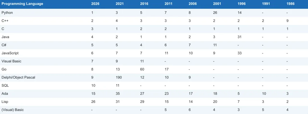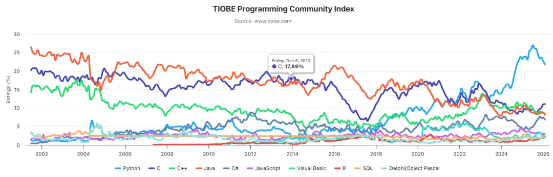 Python,C,C++,Java,C#,JavaScript,Visual Basic,R,SQL,Delphi/Object Pascal。Python,C,C++,Java,C#,JavaScript,Visual Basic,R,SQL,Delphi/Object Pascal 历史走势图:Algol, Alice, Apex, Awk, Bash, C shell, Caml, CL (OS/400), Clojure, Common Lisp, F#, Forth, GAMS, GML, Groovy, Hack, Icon, Inform, Io, J, J#, JScript, JScript.NET, Korn shell, ML, Modula-2, Mojo, MQL5, MS-DOS batch, NATURAL, Nim, OCaml, OpenCL, Q, REXX, RPG, S, Scheme, Small Basic, Smalltalk, Solidity, SPARK, Structured Text, Tcl, V, Vala/Genie, VHDL, WebAssembly, Wolfram, Xojo。TIOBE 每个月都会公布一次编程语言的排行榜,这份排行榜排名基于全球技术工程师、课程和第三方供应商的数量,其中包括了流行的搜索引擎以及技术社区,如 Google、百度、维基百科等等。数据反映目前主流编程语言的变化趋势,对我们学习和工作可作为一个参考,但各个语言都有它们各自适合的应用场景,所以也不必过于在意,毕竟语言的好坏在于如何去使用它。