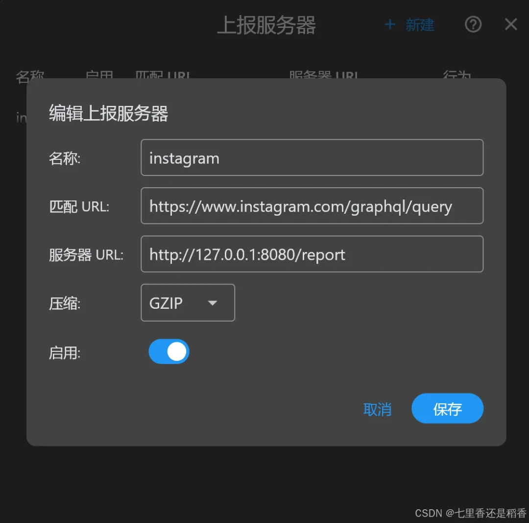发现它有一个很好的功能:上报服务器,它可以按照配置好的上报规则,将对应接口中所有请求的内容和返回的结果,全部打包发送到自己定义的一个服务器上