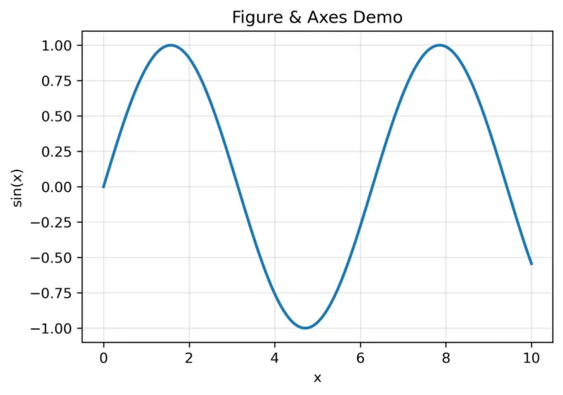ax.plot(x, y, linewidth=2)ax.set_title("Figure & Axes Demo")ax.set_xlabel("x")ax.set_ylabel("sin(x)")ax.grid(alpha=0.3)
