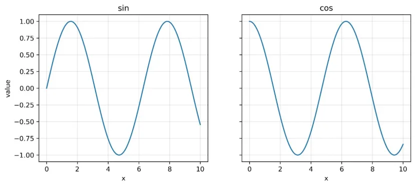 import numpy as npimport matplotlib.pyplot as pltx = np.linspace(0, 10, 200)fig, axes = plt.subplots(1, 2, figsize=(10, 4), sharey=True)axes[0].plot(x, np.sin(x))axes[0].set_title("sin")axes[1].plot(x, np.cos(x))axes[1].set_title("cos")for ax in axes:ax.set_xlabel("x")ax.grid(alpha=0.3)axes[0].set_ylabel("value")fig.savefig("subplots_demo.jpg", dpi=300, bbox_inches="tight")plt.close(fig)