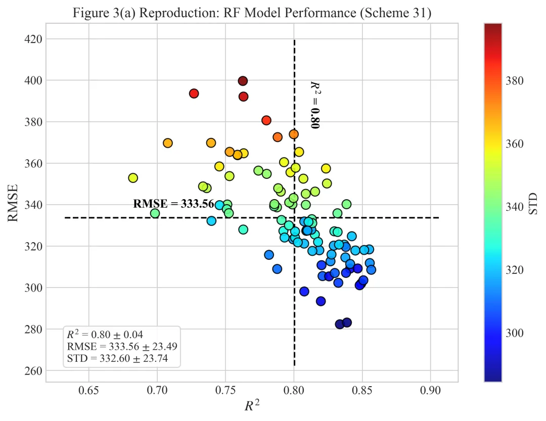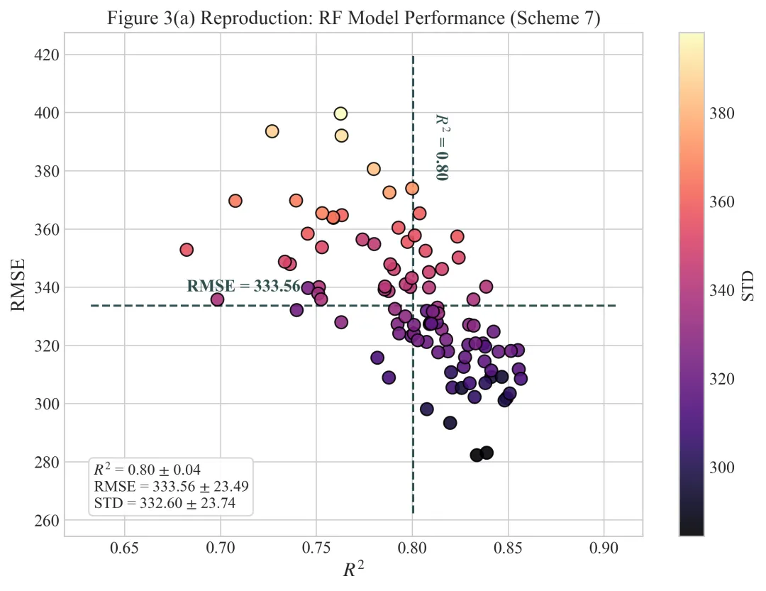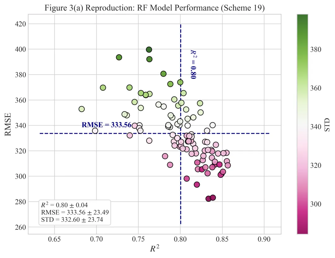 ax.set_xlabel('$R^2$', fontsize=14) #x轴标题ax.set_ylabel('RMSE', fontsize=14) #y轴标题#图框中显示的统计文本内容legend_text = (f'$R^2$ = {r2_mean:.2f} $\pm$ {r2_std_dev:.2f}\n'f'RMSE = {rmse_mean:.2f} $\pm$ {rmse_std_dev:.2f}\n'f'STD = {std_mean:.2f} $\pm$ {std_std_dev:.2f}')#文本框样式属性props = dict(boxstyle='round', #边框样式,圆角矩形facecolor='white', #填充颜色alpha=0.9, #透明度edgecolor='lightgrey') #边缘颜色#添加统计信息文本框ax.text(0.05, #x0.05, #ylegend_text, #文本内容transform=ax.transAxes, #坐标变换fontsize=11, #字体大小verticalalignment='bottom', #垂直对齐bbox=props) #边框样式