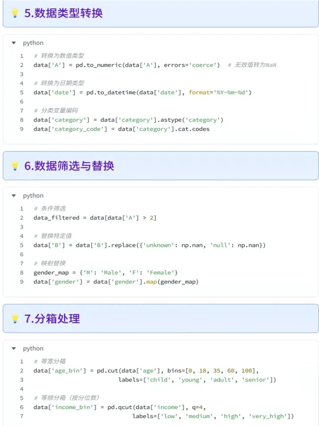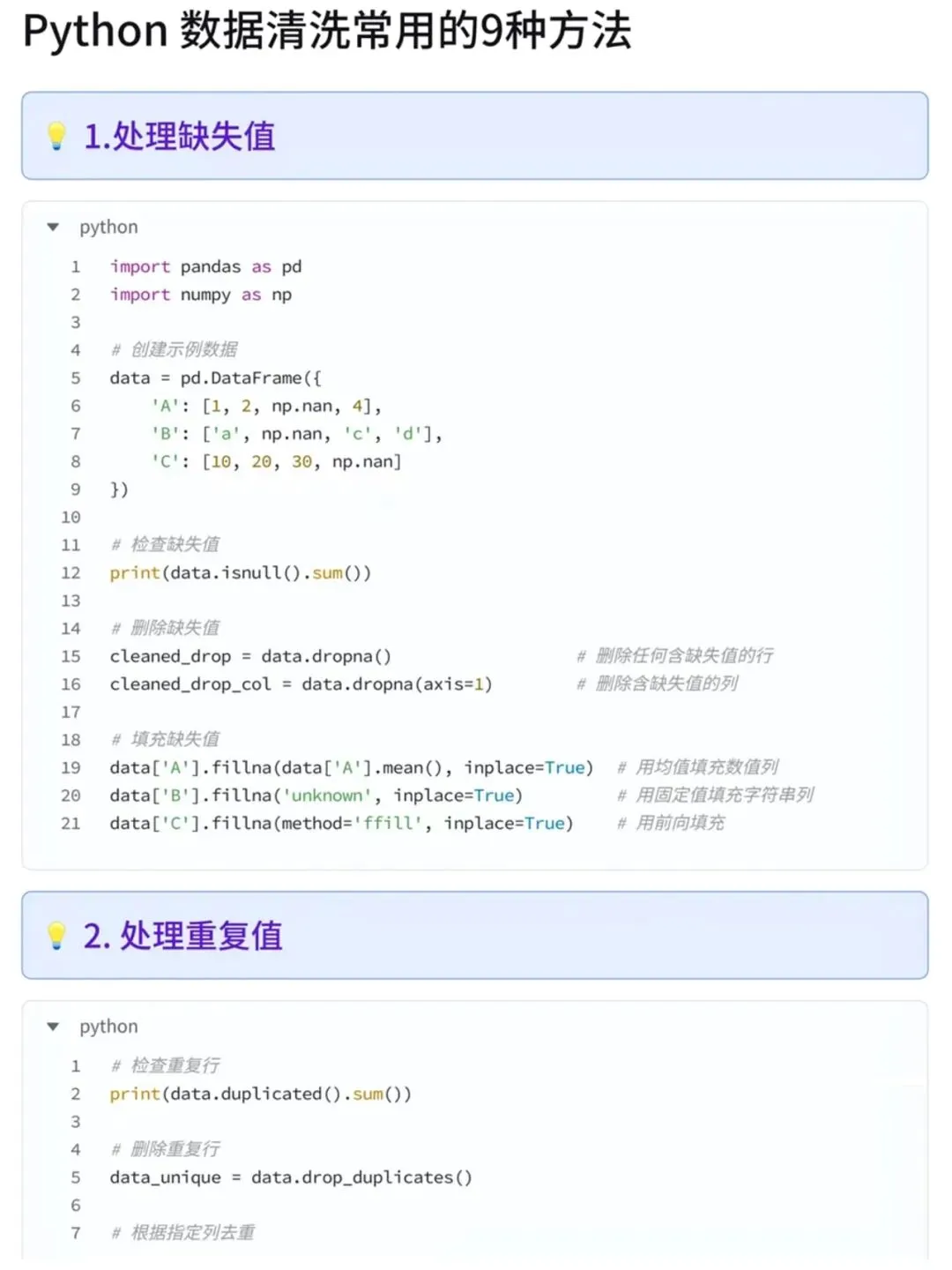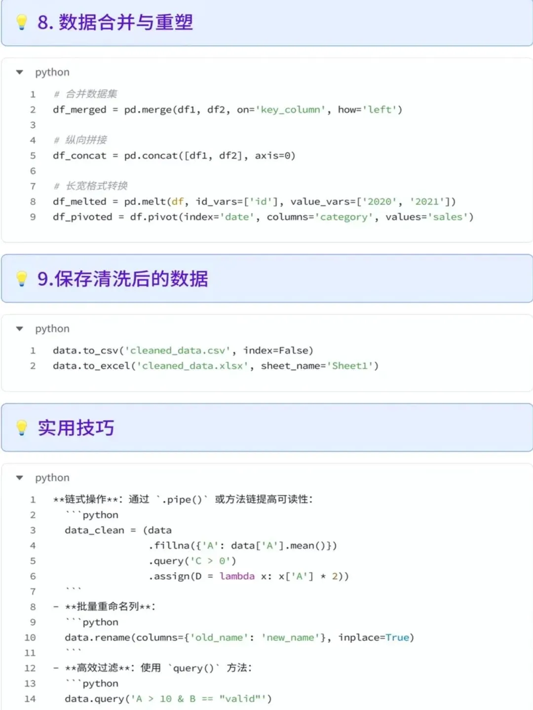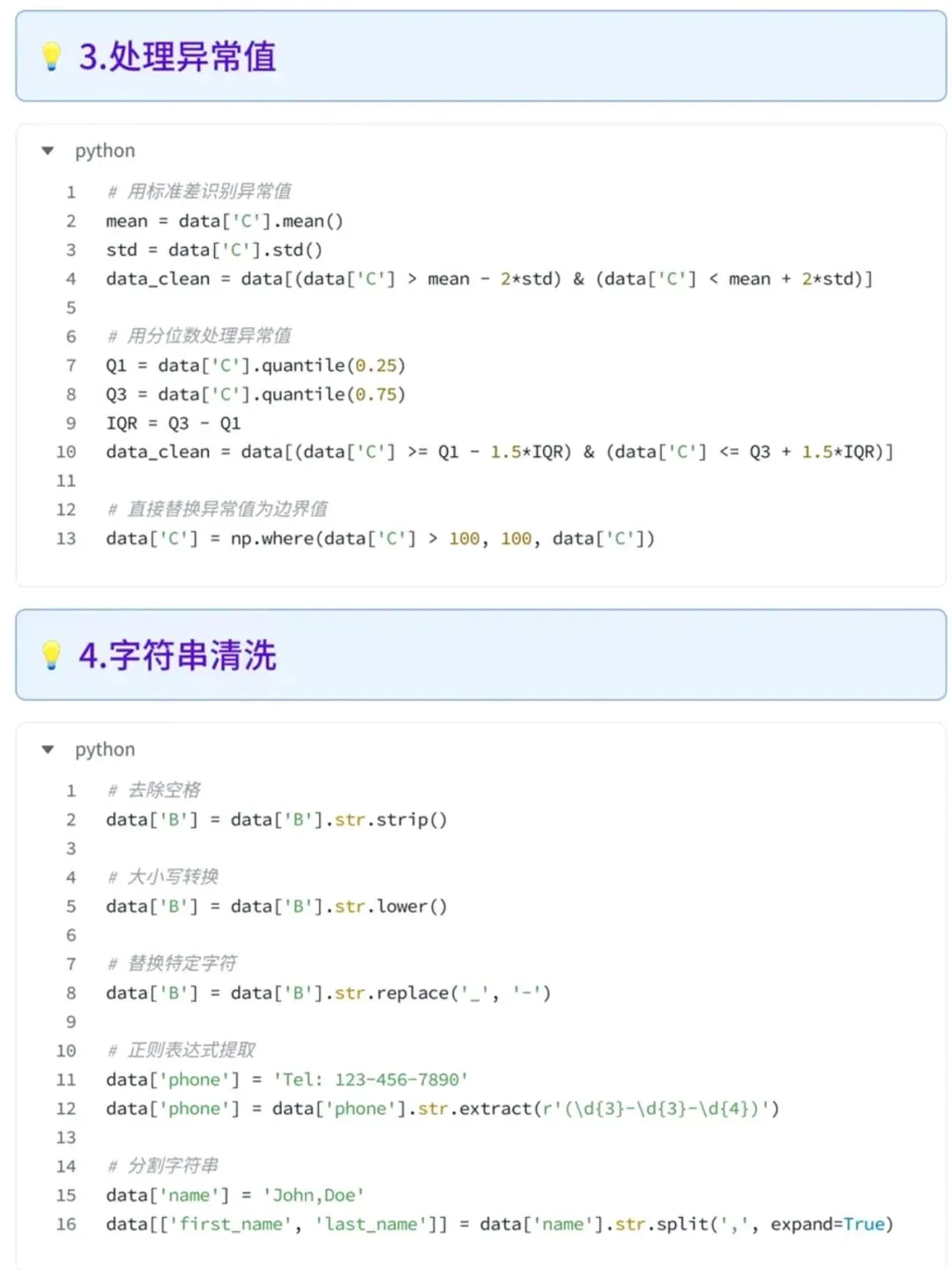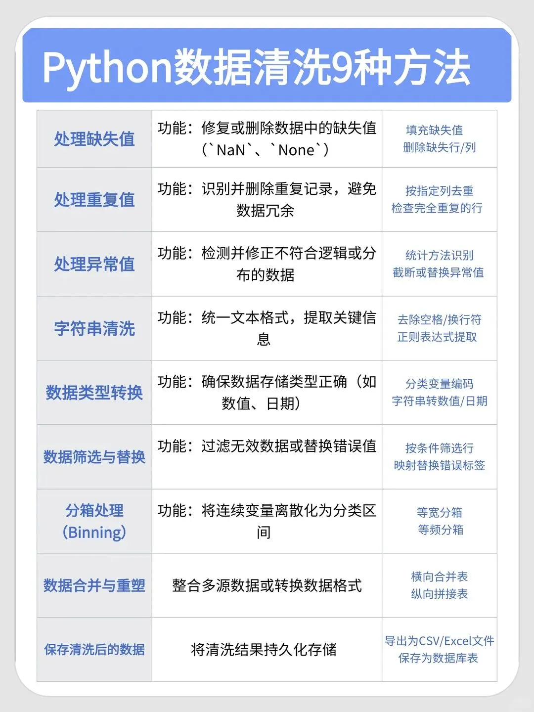 今天整理了Python的9大数据清洗的方法,熟练使用数据清洗能大大加快我们的工作效率,为了方便大家学习使用,同时附上了可以直接使用的代码段9大清洗方法: 1. 处理缺失值(删除/填充) 2. 去除重复值 3. 处理异常值 4. 字符串清洗 5. 数据类型转换 6. 数据筛选与替换 7. 分箱处理 8. 数据合并与重塑 9. 保存清洗后的数据