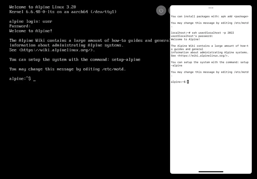 如果你觉得 UTM 自带的 TTY 界面不够顺手,可以用 iSH Shell(或电脑上的 SSH 客户端)通过 SSH 登录虚拟机。