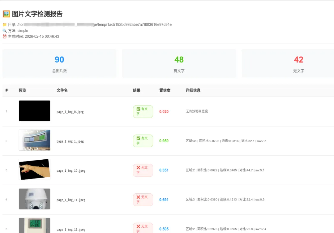python check_images_text.py /path/to/your/folder ocr运行结束后会在根目录生成 text_detection_report.html,用浏览器打开即可看到完整报告。