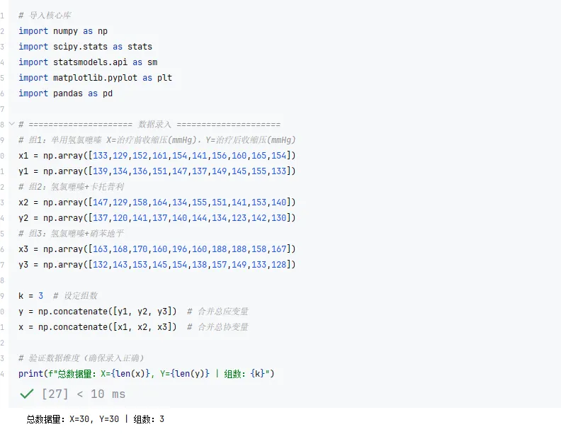 阶段1:环境导入与数据录入,导入核心分析库,录入高血压降压药试验的三组原始数据,合并总数据并验证维度。# 导入核心库import numpy as npimport scipy.stats as statsimport statsmodels.api as smimport matplotlib.pyplot as pltimport pandas as pd# ===================== 数据录入 =====================# 组1:单用氢氯噻嗪 X=治疗前收缩压(mmHg),Y=治疗后收缩压(mmHg)x1 = np.array([133,129,152,161,154,141,156,160,165,154])y1 = np.array([139,134,136,151,147,137,149,145,155,133])# 组2:氢氯噻嗪+卡托普利x2 = np.array([147,129,158,164,134,155,151,141,153,140])y2 = np.array([137,120,141,137,140,144,134,123,142,130])# 组3:氢氯噻嗪+硝苯地平x3 = np.array([163,168,170,160,196,160,188,188,158,167])y3 = np.array([132,143,153,145,154,138,157,149,133,128])k = 3 # 设定组数y = np.concatenate([y1, y2, y3]) # 合并总应变量x = np.concatenate([x1, x2, x3]) # 合并总协变量# 验证数据维度(确保录入正确)print(f"总数据量:X={len(x)}, Y={len(y)} | 组数:{k}")